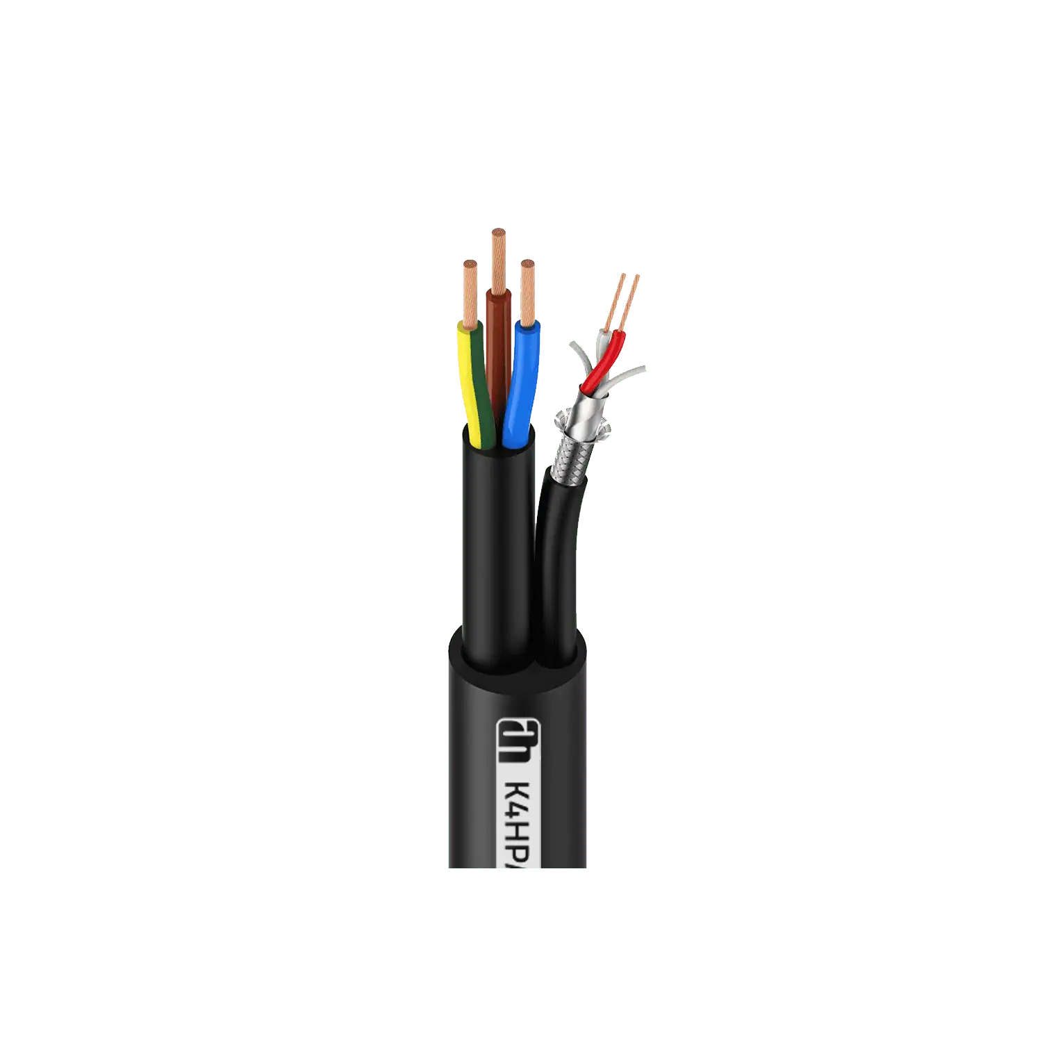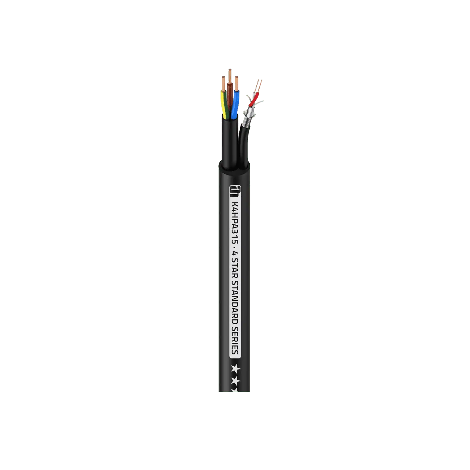 Bobina cavo ibrido per l’alimentazione parallela di segnali audio e alimentazione in un solo cavo. Schermo a spirale in rame denso con lamina AL/PT e guaina in PVC altamente flessibile.