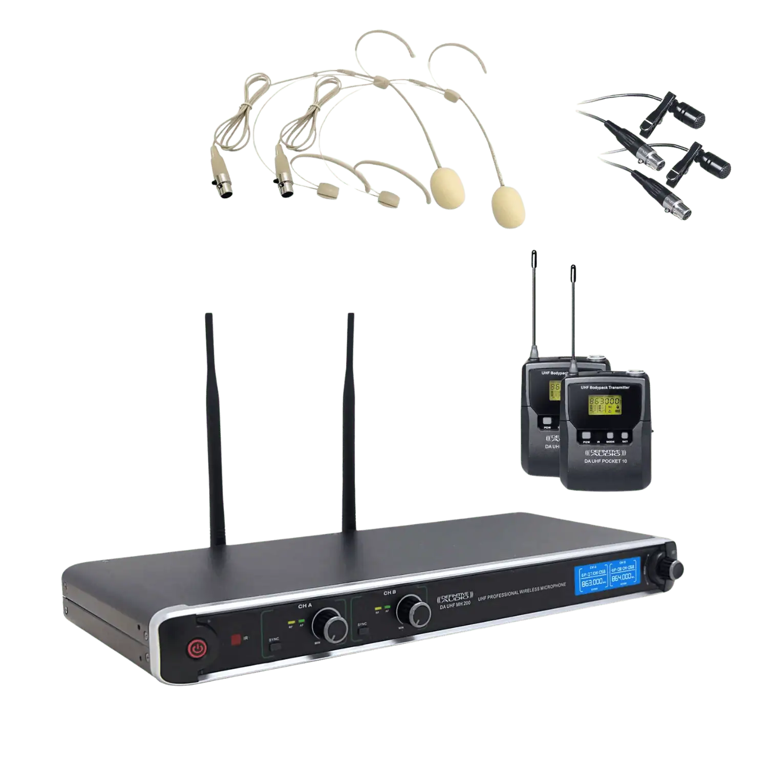 Sistema Radiomicrofono DEFINITIVE AUDIO Uhf PT200 con 2 bodypack e archetti