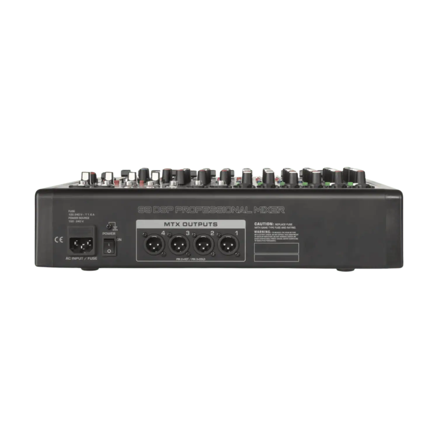 Mixer analogico compatto con DSP a 32 bit e scheda audio full duplex integrati e 99 effetti. Ha 4 gruppi di uscita ausiliari selezionabili indipendentemente, con selettore a matrice e equalizzatore a 9 bande sul master. Le 2 uscite AUX garantiscono un‘ottima autonomia per il live ma anche per il collegamento di outboard in studio. Effettistica interna, collegamento bluetooth, scheda audio integrata e lettore mp3 completano le caratteristiche di questo mixer.