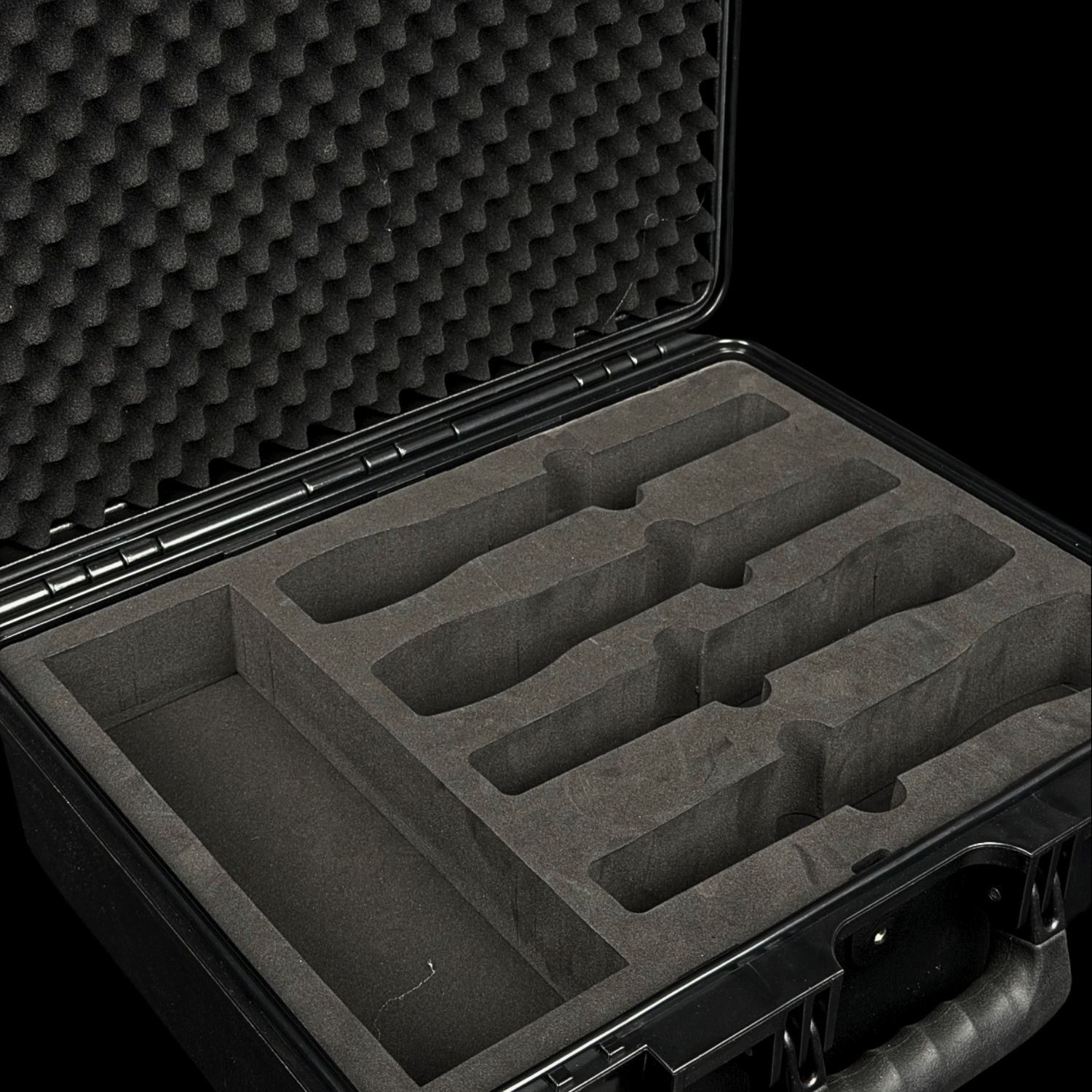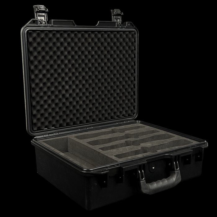 Custodia Impermeabile per 4 Microfoni wireless e bodypack. Impermeabile, antipolvere e antiurto, con schiuma sagomata e vano accessori. Ideale per live, touring e service audio professionali.