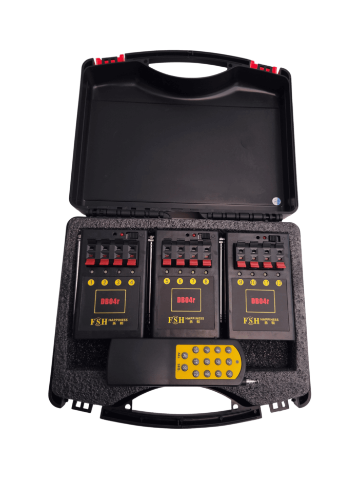 Il Sistema di Accensione Wireless DB04R rappresenta una soluzione versatile e affidabile pensata per chi necessita di un firing system pirotecnico completo, facile da usare per il controllo sicuro di spettacoli pirotecnici e fontane fredde. Questo kit include 3 accenditori pirotecnici, un telecomando a distanza programmabile fino a 12 canali con controllo wireless.