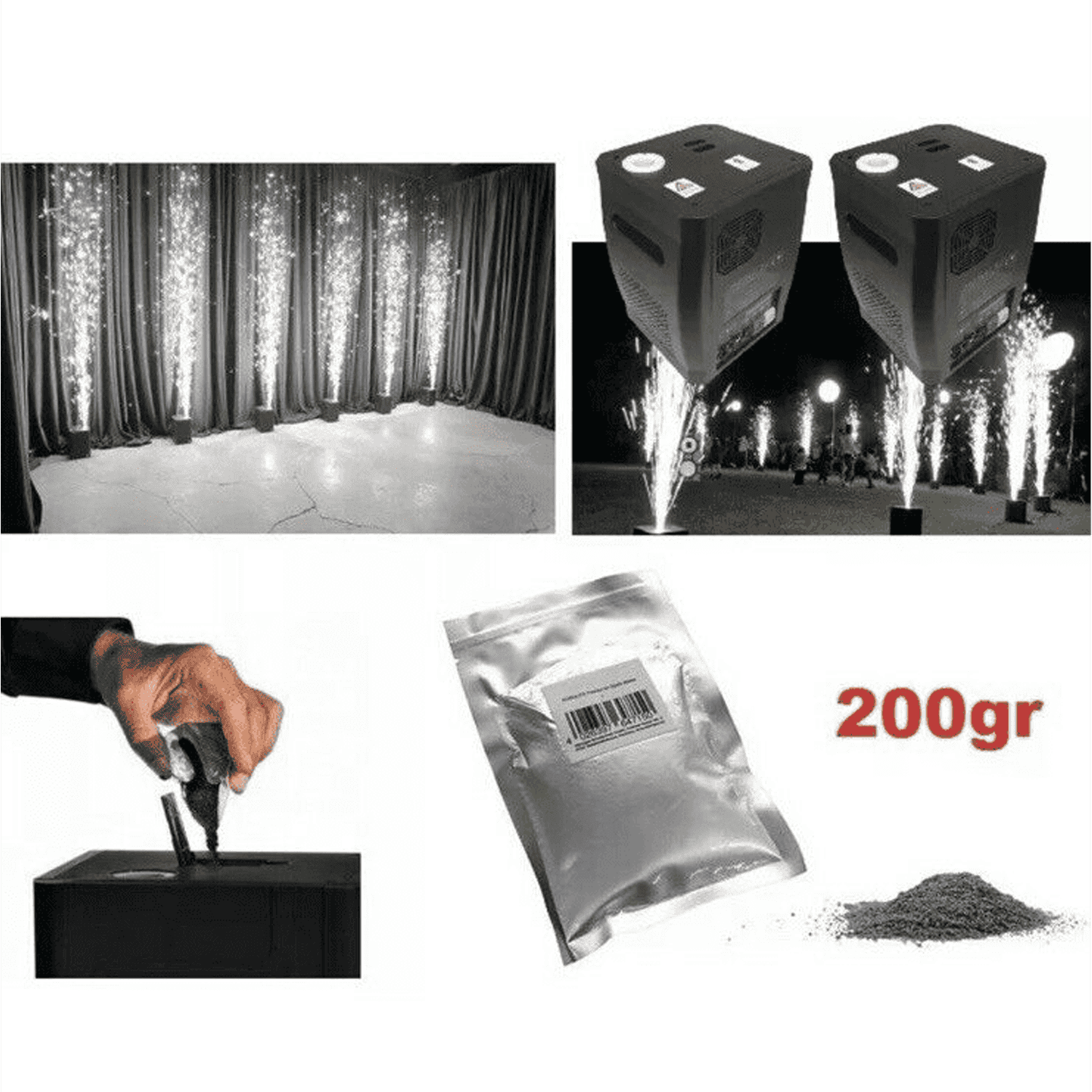 Polvere di ricarica per Spark Machine in buste sottovuoto, con granulato di lega di titanio e zirconio, sviluppato appositamente per fontane a scintille fredde, è possibile creare effetti di scintille a fontana alti fino a 6 metri per un tempo di 40 minuti. Ottima per le macchine simili alle spark da 300W a 950W Non macchia e non rilascia fumi o odori. Polvere da Esterno, Outdoor.