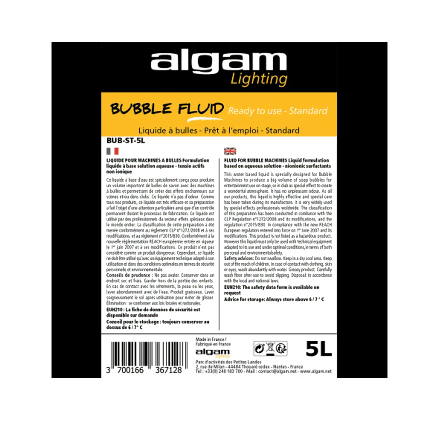 L’Algam Lighting BUB-ST-5L liquido pronto all’uso. Produce grandi quantità di bolle di sapone nel pieno rispetto delle normative vigenti. Non ha un odore sgradevole e non lascia alcun residuo oleoso. Non irritante e non infiammabile. Affidabile per i performer e compatibile con la maggior parte delle macchine da bolle.