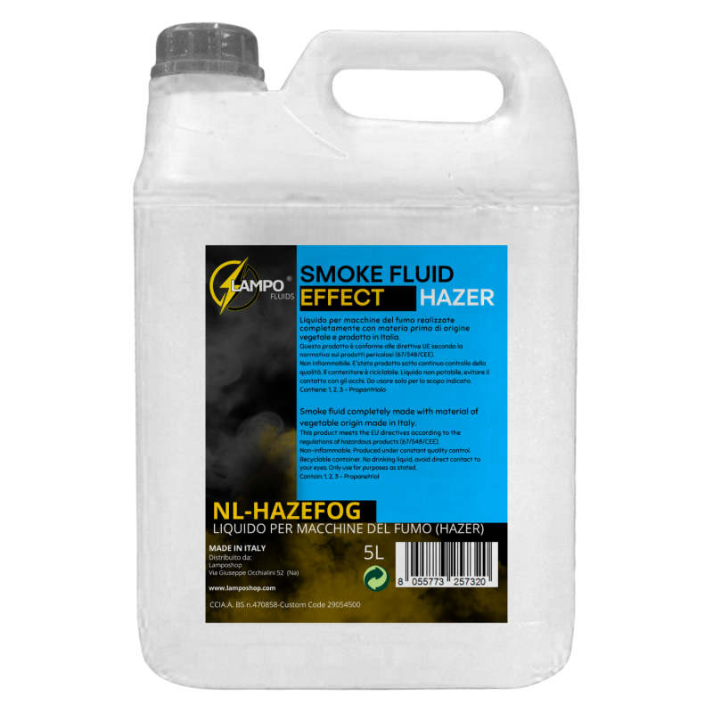 Il contenitore da 5 litri, con un peso di 5 kg, è pratico da trasportare e da utilizzare. Il prodotto è pronto all’uso, non necessita di diluizione e può essere versato direttamente nella macchina del fumo. La compatibilità è garantita con la maggior parte dei dispositivi professionali presenti sul mercato, rendendo Lampo Fluids una scelta versatile per tecnici audio-luci, organizzatori di eventi e professionisti dello spettacolo.