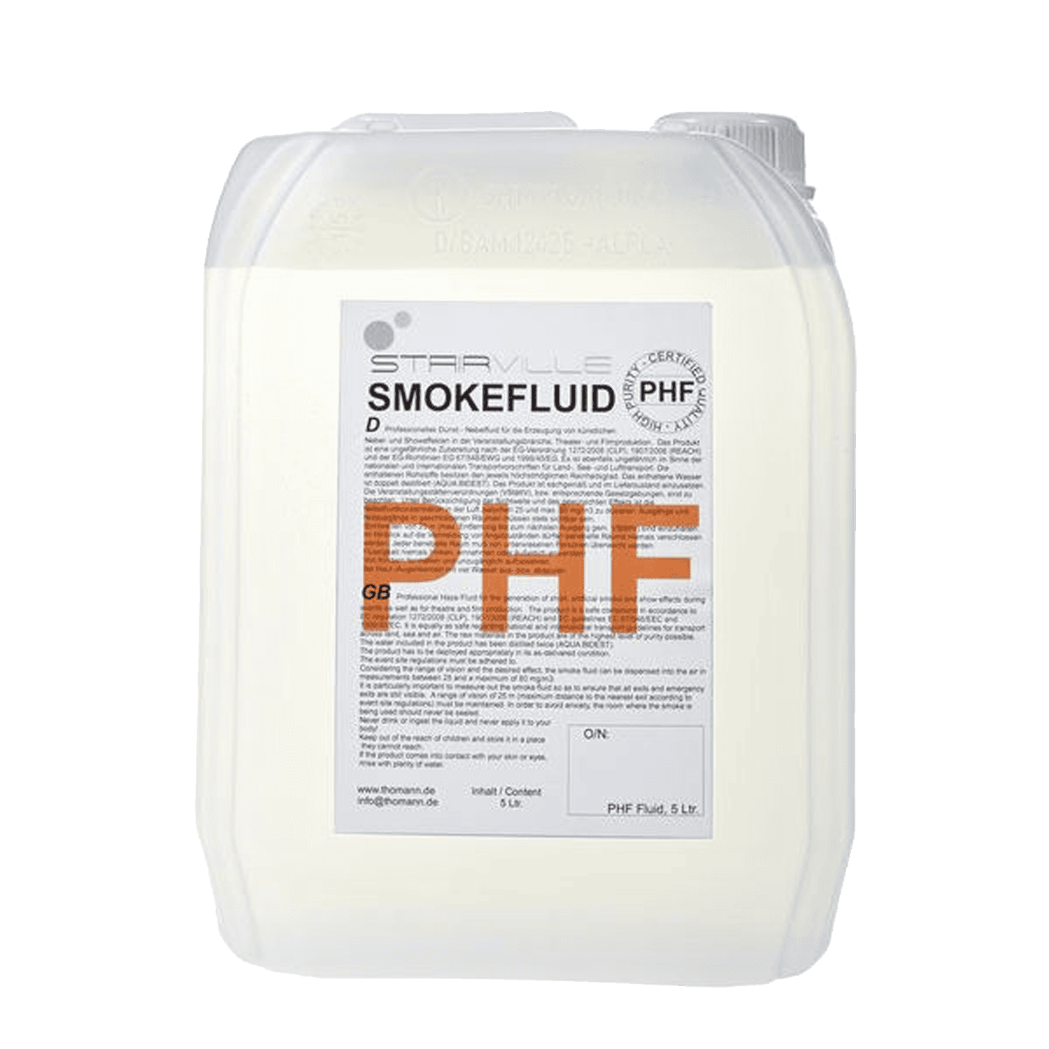Il liquido PHF è chimicamente identico al liquido JEM Pro Haze. È adatto per creare una foschia molto fine simile alle nuvole di nebbia, ed è ideale per palcoscenici, discoteche e teatri, consigliato anche per spettacoli professionali con luci e laser.