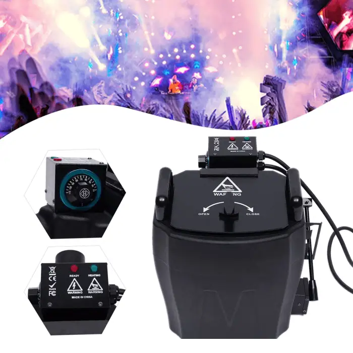 La macchina per il ghiaccio a secco può produrre una grande quantità di fumo basso per utilizzo di grandi spettacoli all’aperto. Il fumo della nostra macchina per il ghiaccio a secco ha un’ alta efficienza si riscalda rapidamente e produce fumo così veloce, poiché la barra riscaldante in acciaio inox e l’elevata potenza di 3500W sono altamente efficienti. Design di controllo elettronico della temperatura: il design di controllo elettronico della temperatura consente una regolazione della temperatura più precisa, consentendo di produrre una quantità e densità di fumo più precisi, che soddisfa le vostre aspettative controllando manualmente con la manopola il livello di intensità . È possibile regolare la temperatura da 30 a 110 gradi ruotando il regolatore di temperatura sul lato del dispositivo, adattandosi alle diverse esigenze. Quando si posiziona il regolatore di fumo da 0 a 1, il dispositivo inizia a fare fumo. Quando si posiziona il regolatore su 2, il fumo esce più velocemente.