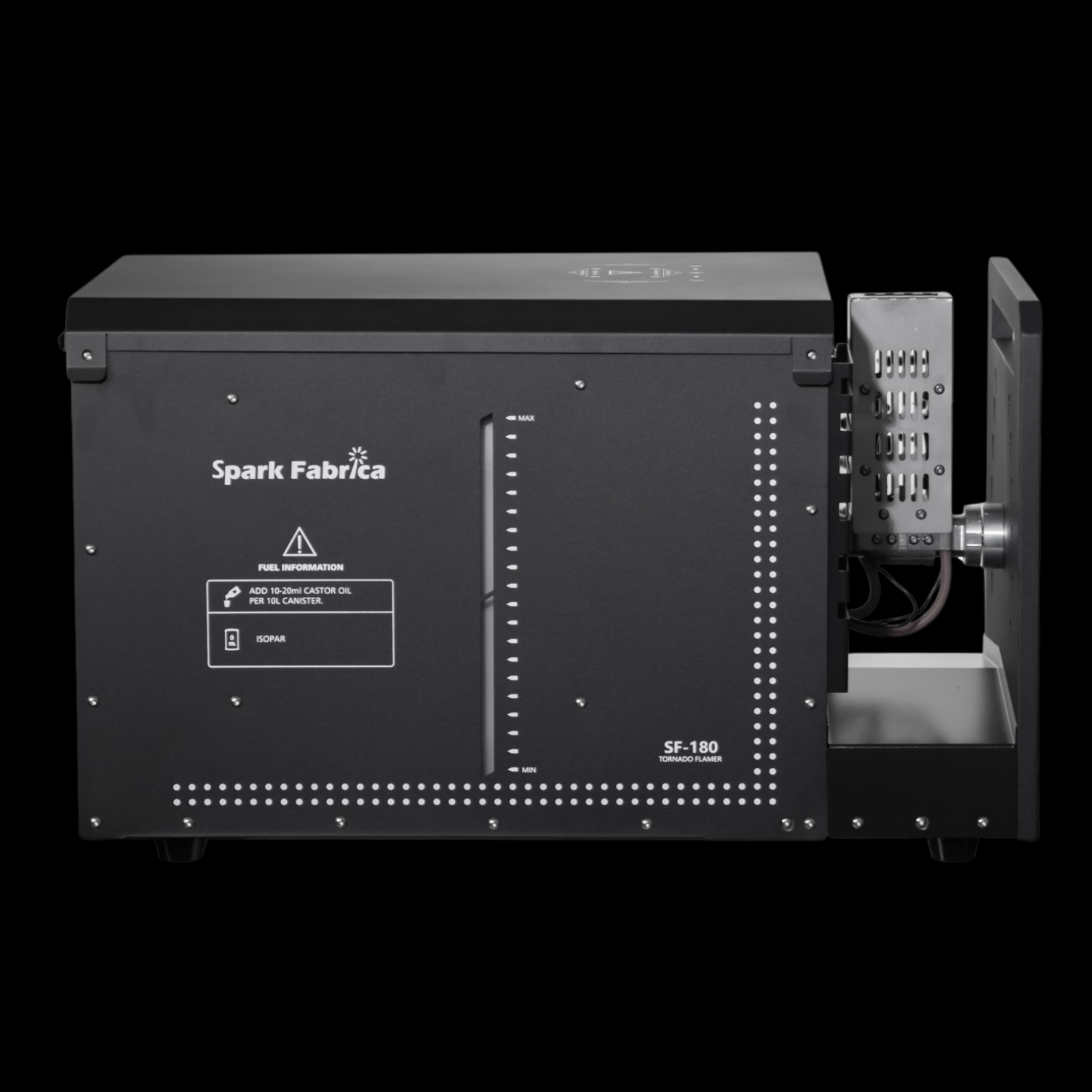 La SF-180 genera fiamme alte fino a 10 metri, utilizzando come combustibile ISOPAR, sicuro ed affidabile, ideale per applicazioni professionali in ambienti esterni. Grazie al controllo intelligente e al protocollo di protezione anti-olio e anti-ribaltamento, questa macchina può essere utilizzata in totale sicurezza, minimizzando i rischi e permettendo di concentrarsi esclusivamente sull’effetto scenico. L’innesco elettronico e le funzionalità integrate assicurano una risposta rapida e precisa, rendendo ogni spettacolo uniforme e spettacolare.