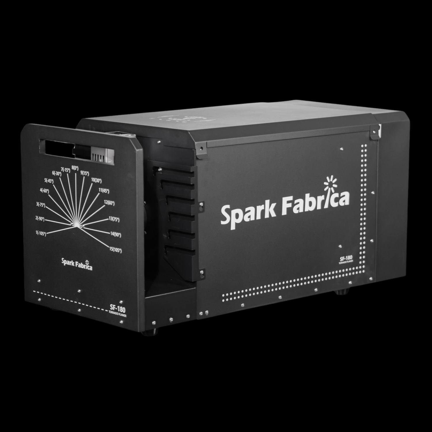 Tornado SF-180 Spark Fabrica: lanciafiamme verticale fino a 10 m con testa mobile 210°, controllo intelligente e flight case incluso per eventi e spettacoli.