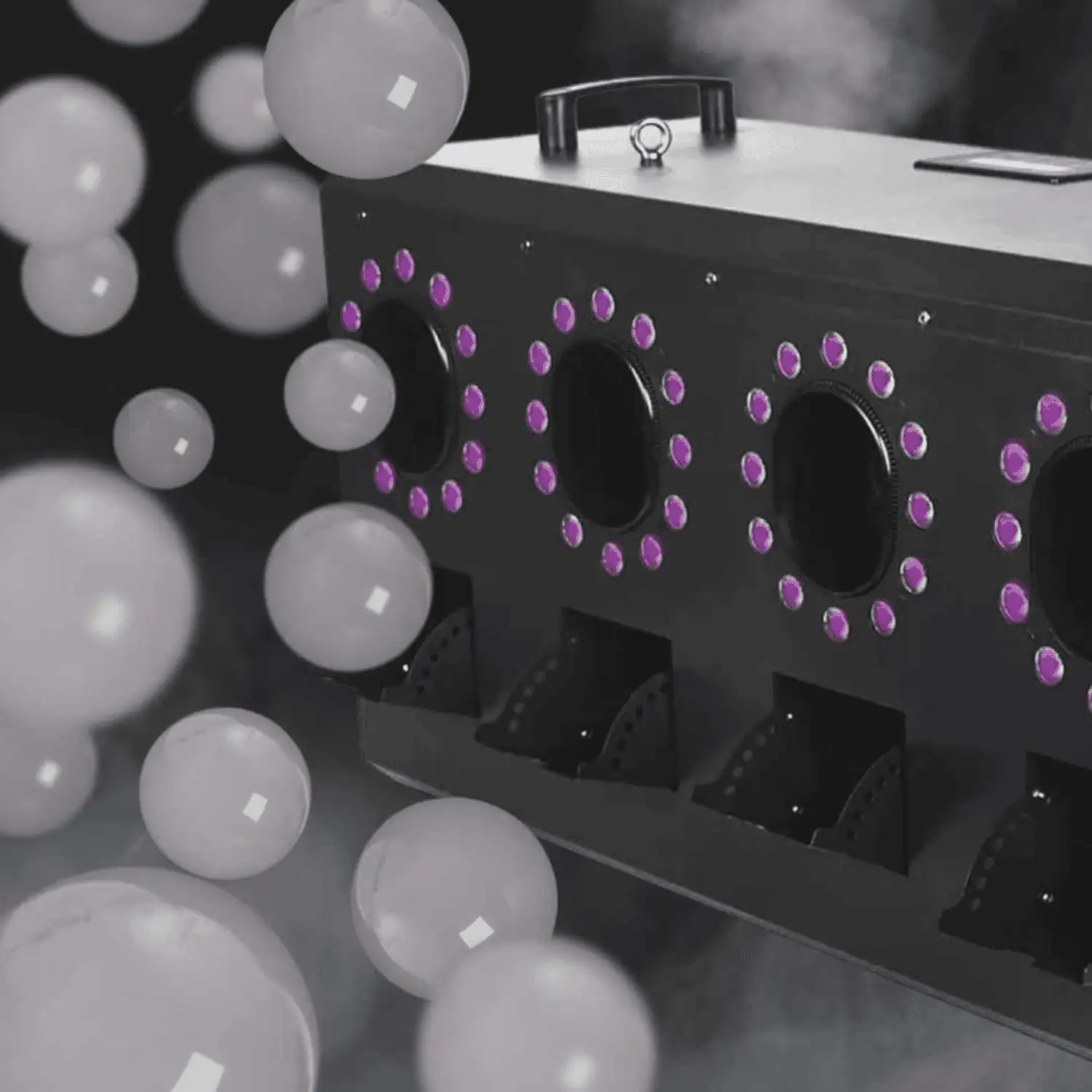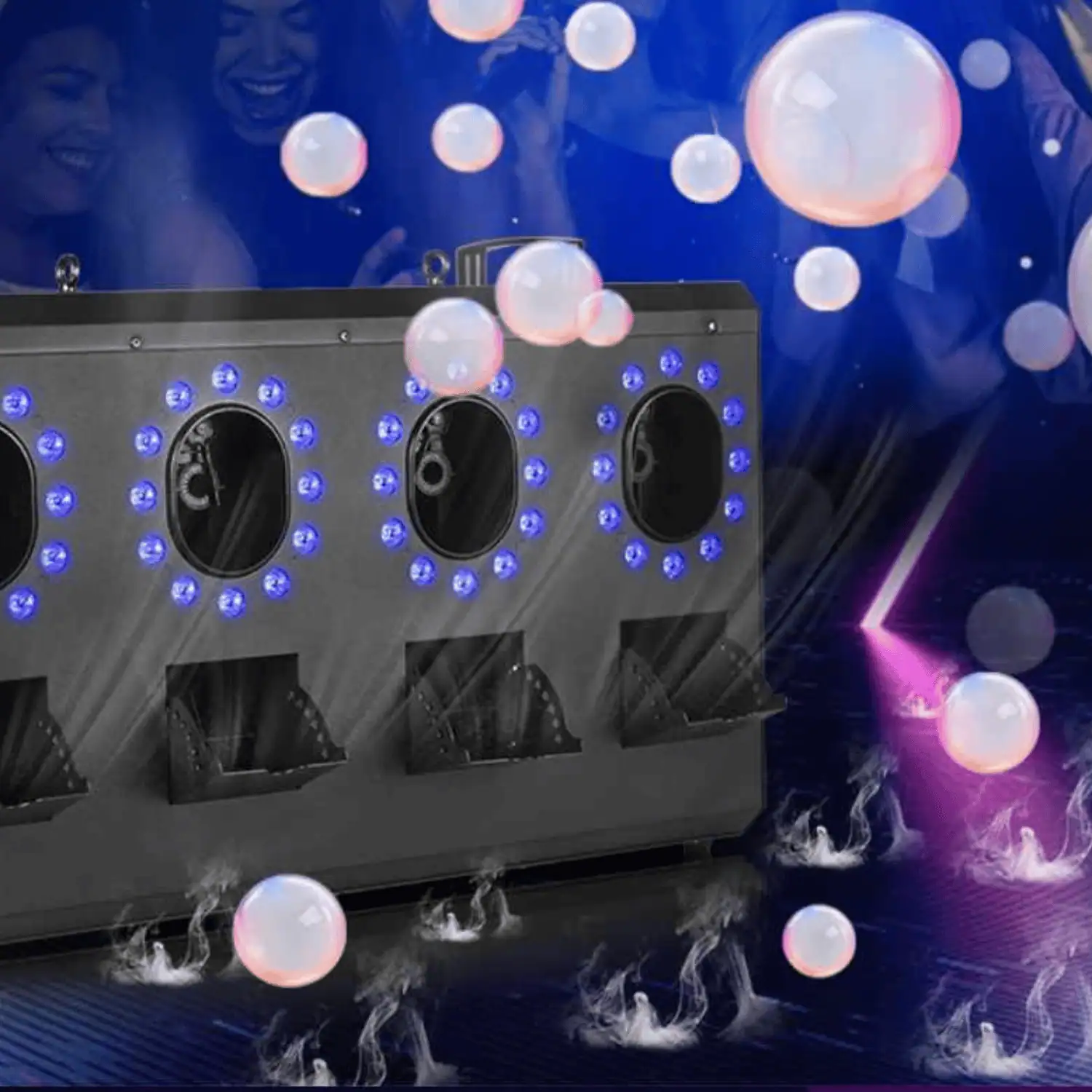 La macchina del fumo e delle bolle NLIGHTING combina del fumo con le bolle e LED 4in1 all’interno di una sola unità. La doppia ventola della macchina crea ogni minuto numerose bolle riempite con del fumo, creando allo stesso tempo un flusso d’aria che spinge le bolle verso l’alto. Questo sistema è dotato di 48LED da 3W RGBW. L’utilizzo della macchina fumo bolle è davvero facile da usare e facile da pulire grazie al sistema con valvola di drenaggio del liquido. Per utilizzare e creare effetti bolle del fumo basterà aggiungere del liquido sia delle bolle e sia quelle del fumo all’interno del serbatoio adatto così saremo in grado di offrire uno show con le bolle ripiene di fumo in modo tale quando scoppieranno si creerà anche l’effetto del fumo. Le modalità disponibili sono: Possibilità di controllare la macchina sia in modo manuale, con telecomando oppure con centralina DMX.