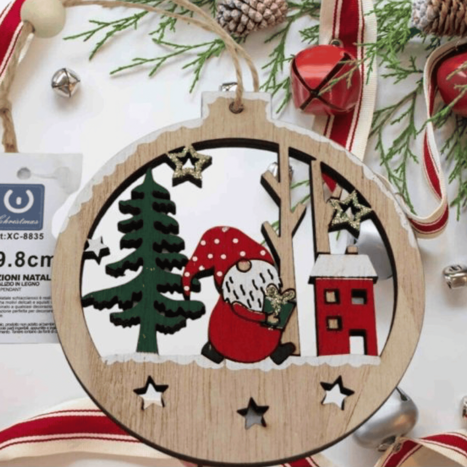9.52Addobbo natalizio pendente a forma ovale in legno da appendere con casetta e babbo natale