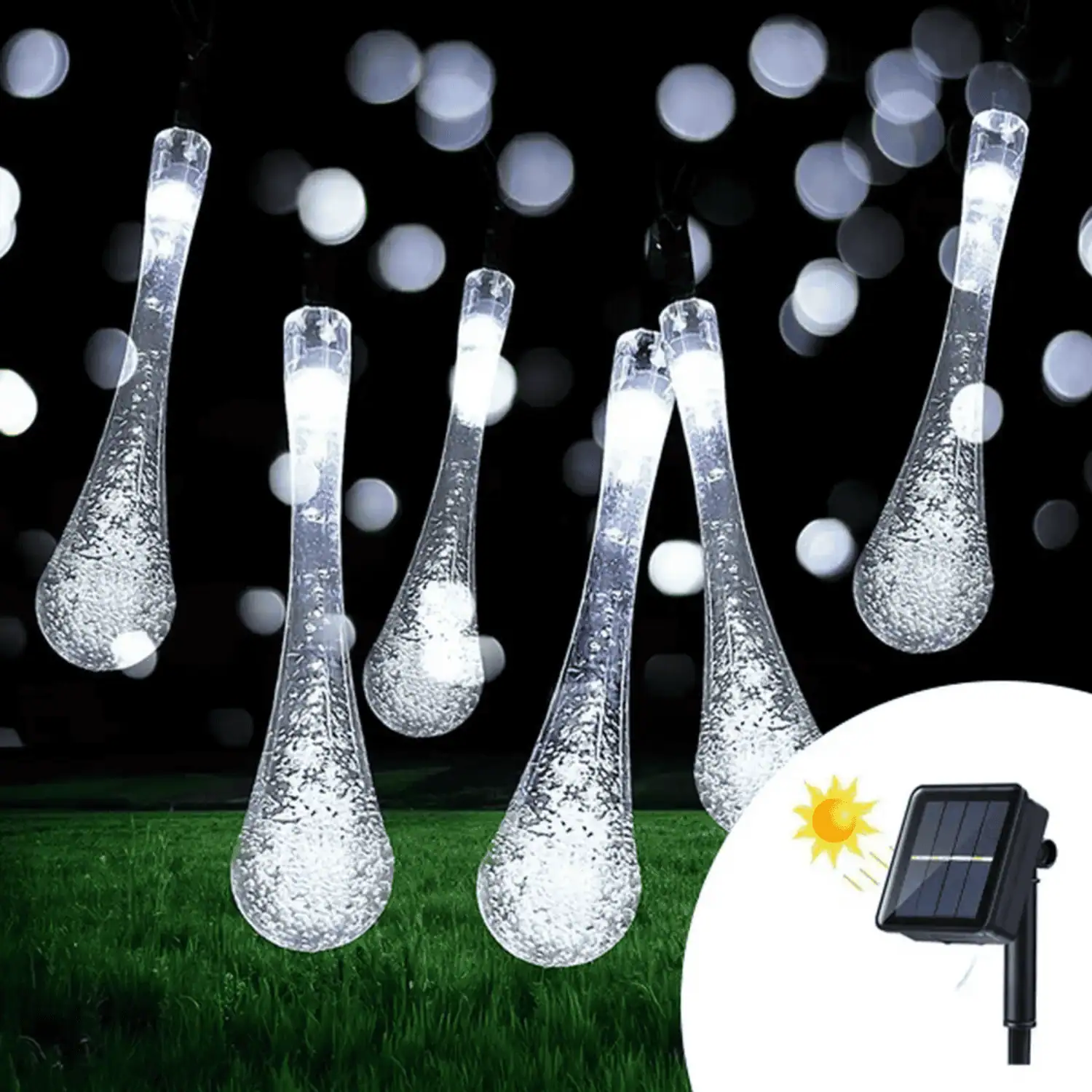 Catena Luminosa Solare di Natale a Forma di Goccia a 50 LED con 8 giochi di Luce per uso Interno/Esterno (Luce Bianca)