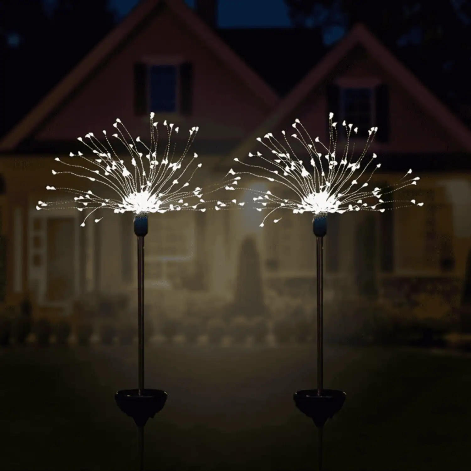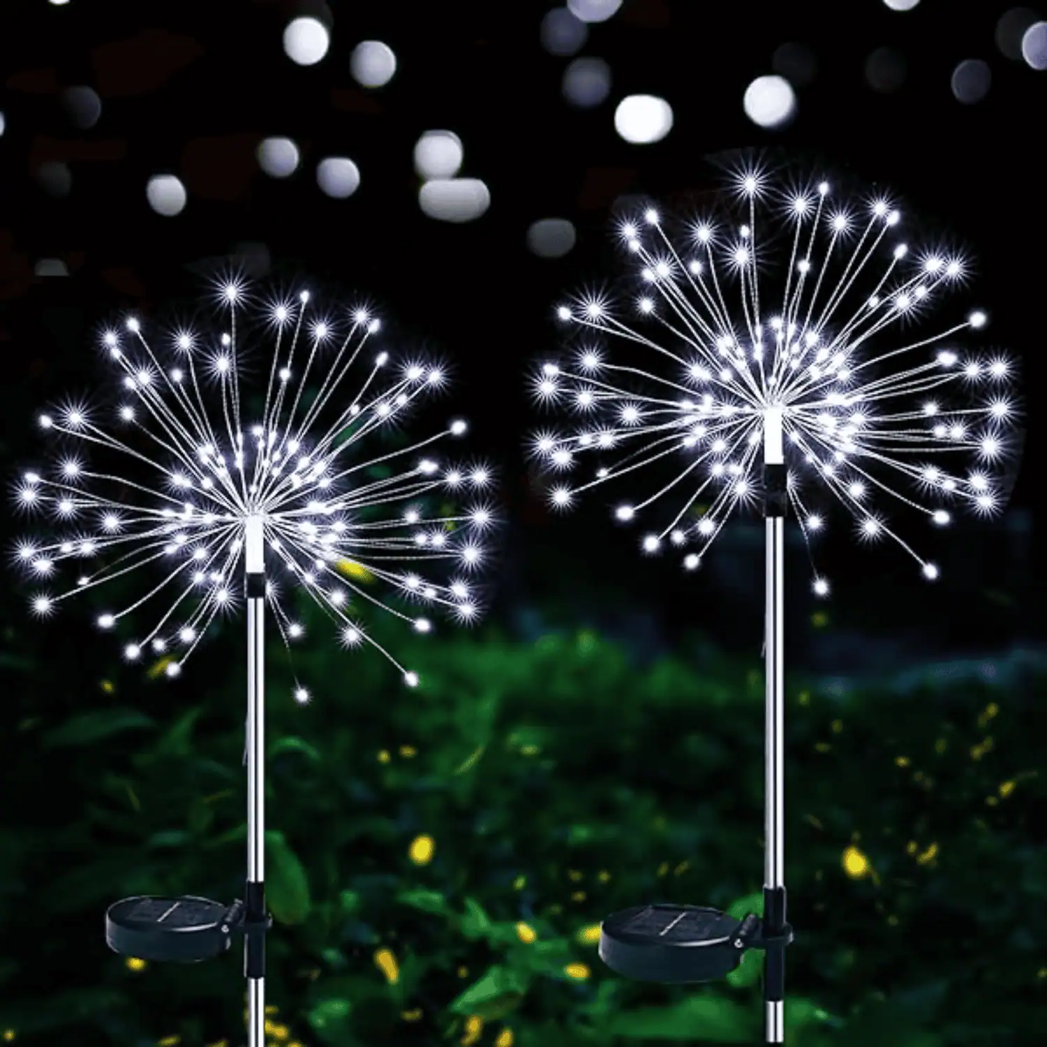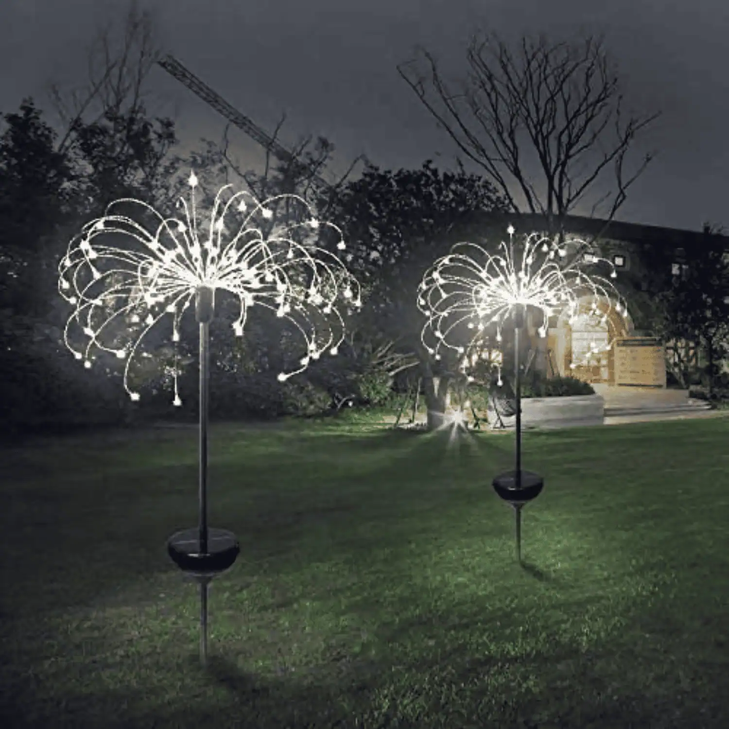 Picchetto luci solare a forma di fuochi d’artificio con filo silver applicabile in ambienti esterni. Adatto come decorazione e per addobbare giardini, gazebi e spazi all’aperto grazie al suo grado di protezione IP44. Munito di trasformatore e controller con 8 giochi di luci tra cui pure la modalità fissa, con luci fisse e intermittenti, può essere ricaricato grazie all’energia solare.