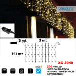 Tenda luminosa allungabile di natale con filo bianco applicabile in ambienti esterni ed interni. Adatta come decorazione e l’allestimento di case, perfetta anche per addobbare giardini, gazebi e spazi all’aperto grazie al suo grado di protezione IP44. Munita di trasformatore con luci calde fisse e bianche intermittenti.