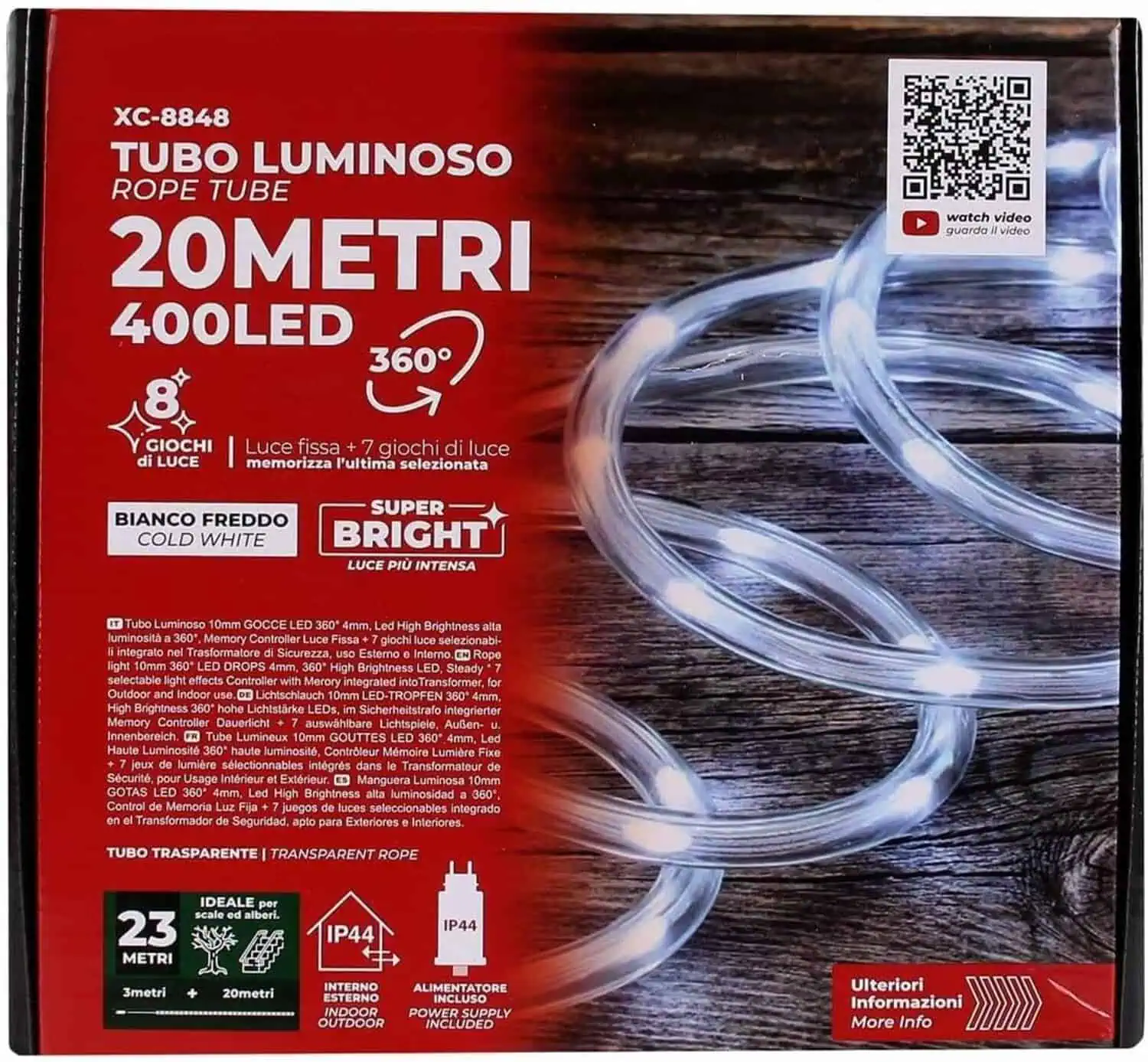 Il tubo luminoso è lungo 20 metri e contiene 400 LED a luce fredda, distribuiti in modo uniforme ogni 5 cm. Una caratteristica importante è che il tubo non è tagliabile donando una maggiore durata e sicurezza. Alimentazione tramite presa elettrica da 230V dotato di trasformatore con pulsante integrato, che permette di scegliere 8 modalità di illuminazione pre impostate.