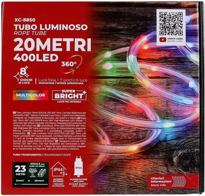 Con una lunghezza complessiva di 20 metri e 400 LED multicolore (distanziati ogni 5 cm), questo tubo luminoso permette di coprire ampie superfici, garantendo una luminosità uniforme e scenografica. Il tubo non è tagliabile, il che garantisce l’integrità del circuito e la massima sicurezza durante l’uso prolungato.