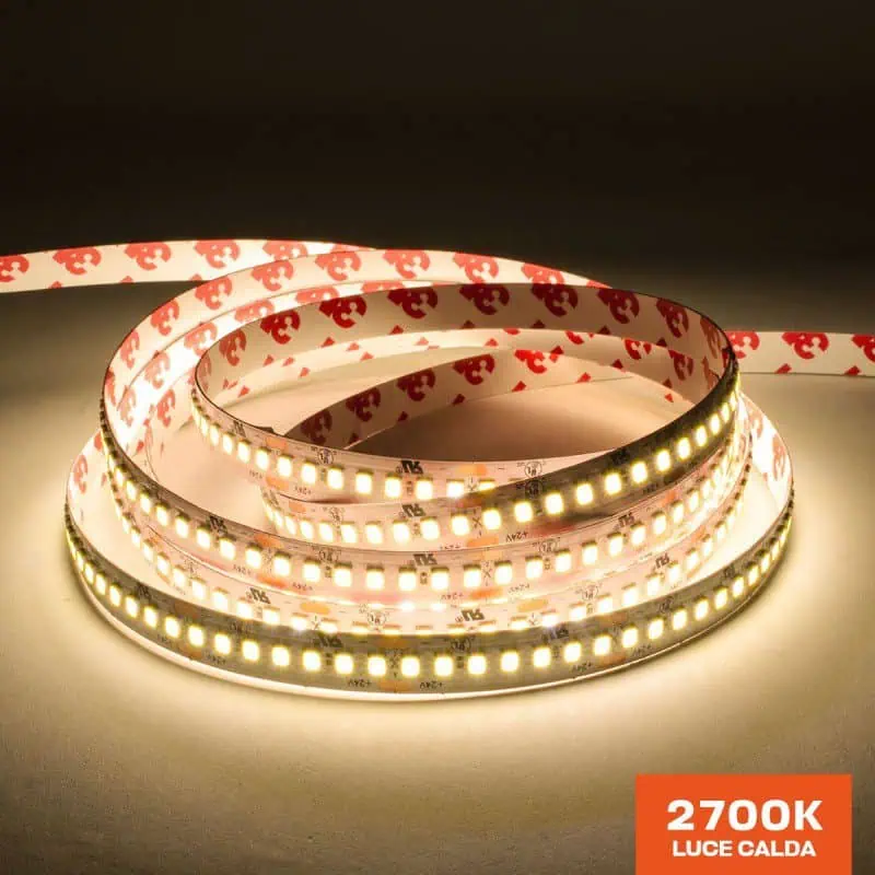 Ha una potenza complessiva di 96W (venduta in bobine da 5 metri) e una potenza effettiva di 19,2W al metro. Se stai cercando una striscia led da 24V molto luminosa, ma con un basso assorbimento energetico, allora questo modello di strip led è quello che fa per te. Grazie ai suoi 1050 Chip LED (210 LED/mt) modello 2835 riesce ad emettere fino a 12500 lm (2500 lm al metro) con un’efficienza luminosa pari a 130 lm/mt.