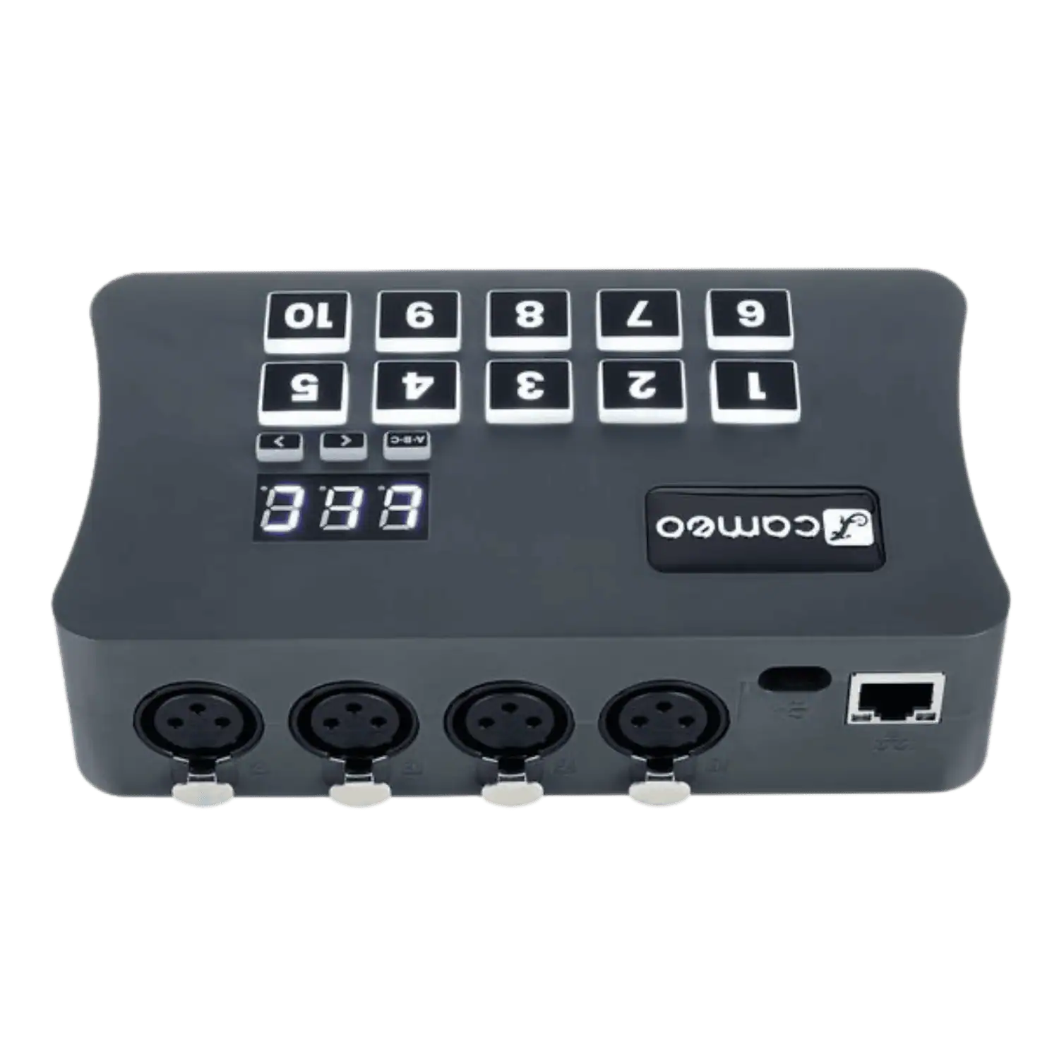 L’interfaccia Cameo DVC CUE con il relativo software e i dispositivi di illuminazione compatibili con DMX possono essere comodamente controllati da PC o Mac. Nella modalità live o stand-alone, l’interfaccia plug and play offre due universi DMX512 ampliabili su quattro universi e 2048 canali DMX. L’interfaccia presenta una porta USB-C per l’alimentazione e il collegamento al computer, quattro uscite DMX a 3 poli e una porta Ethernet per il controllo esterno. Per l’uso senza computer, in modalità stand-alone, è possibile salvare delle scene pre-programmate su una microSD e richiamarle direttamente sull’interfaccia tramite dieci tasti retroilluminati. Il pulsante ABC consente di navigare tra cinque zone metre i tasti freccia tra 99 scene. Nella modalità di funzionamento stand-alone si utilizza un alimentatore USB standard da 5V. Supporta i seguenti sistemi operativi: android, iOS, mac OS, windows.