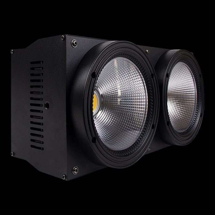 Accecatore LED COB 200W con 2 chip Osram, luce calda 3000K, DMX512, PowerCon, dimmer e strobo. Ideale per teatri, concerti, discoteche, eventi live