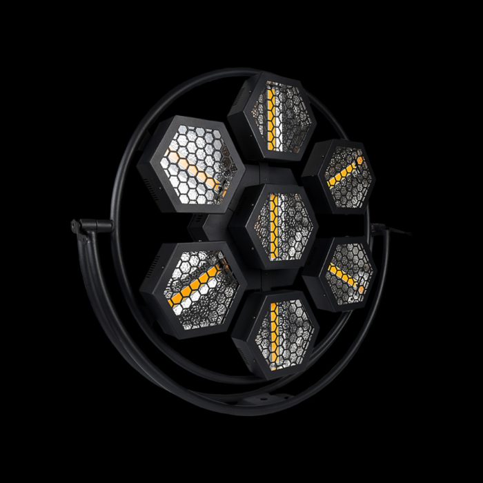 Il design vintage retrò del Mini Port Flower cattura immediatamente l’attenzione grazie alla sua forma circolare e ai sette moduli LED esagonali disposti in una struttura a nido d’ape. Questa configurazione geometrica non solo è esteticamente accattivante, ma assicura una distribuzione uniforme della luce, creando un impatto visivo scenografico. Ogni esagono è dotato di illuminatori RGB e di una sorgente COB con luce calda da 2700K, pensata per riprodurre l’intensità e la morbidezza delle lampade alogene tradizionali, offrendo allo stesso tempo la versatilità cromatica dei LED moderni. Il risultato è una luce potente, dinamica e naturale, capace di adattarsi a qualunque contesto: dai toni caldi e accoglienti per ambientazioni romantiche, alle combinazioni cromatiche vibranti per spettacoli e installazioni artistiche.