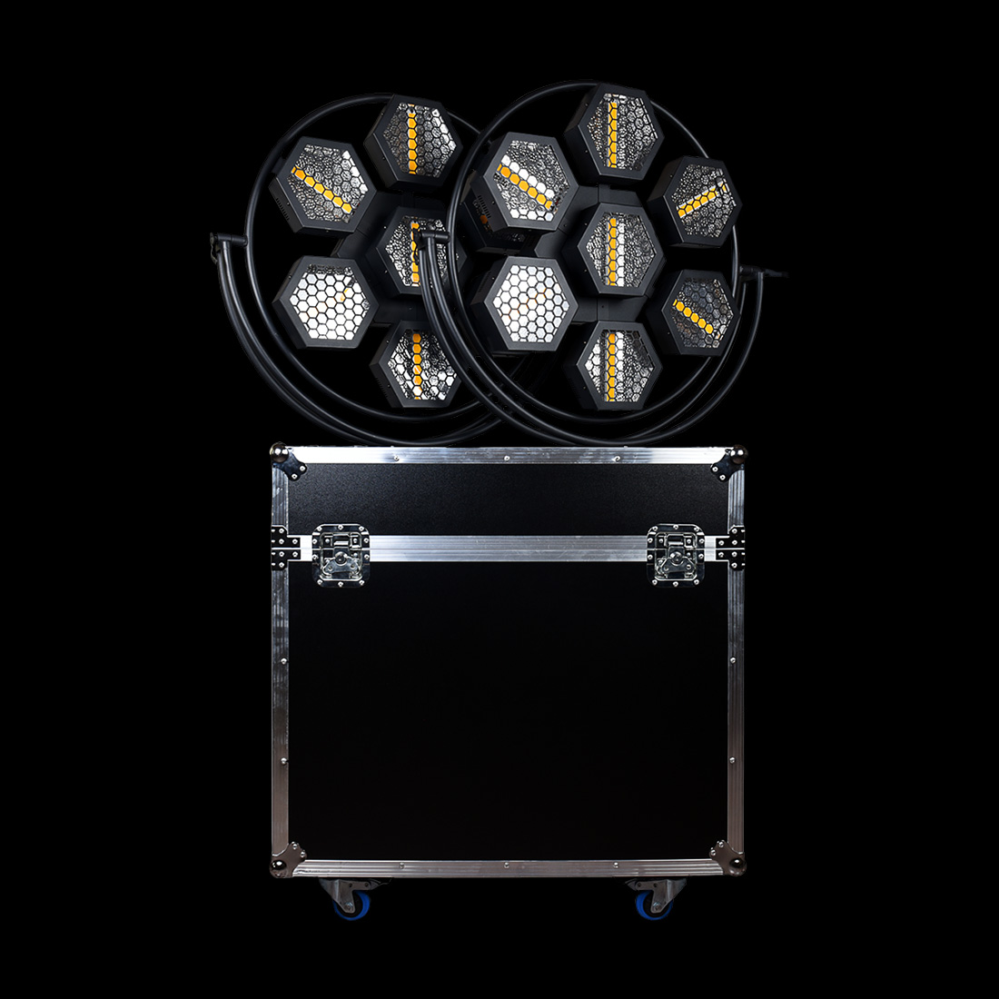 Lampada Port Flower 7 – Illuminazione Professionale a LED RGB 480W – Effetti Luminosi Scenografici per Eventi, Concerti e Teatri – Riflettore con 7 Moduli Esagonali – Coppia con Fly Case