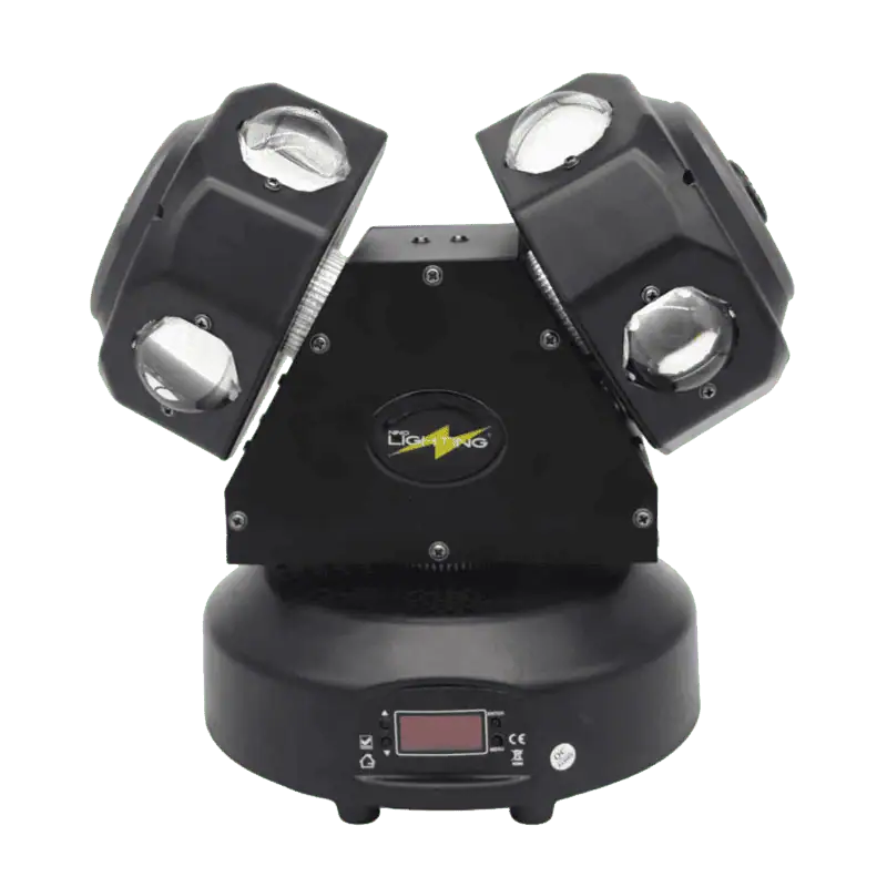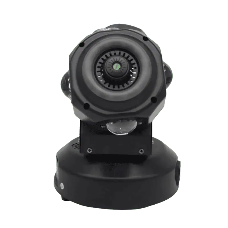 La mini testa mobile Bee Eye RGBW Può essere utilizzata da sola o in combinazione con una varietà di effetti luce, presentando un’illuminazione estremamente dinamica e di alta qualità creando facilmente effetti di luce con pattern sorprendenti con elevata tonalità di colori. Al centro troviamo un Laser potente e luminoso rotante colore verde.