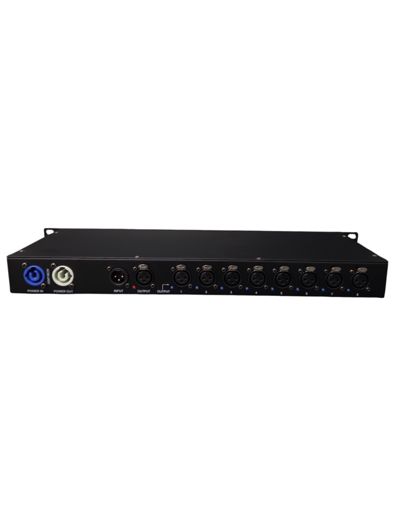 Splitter DMX professionale a 8 uscite con ingressi DMX IN/OUT e alimentazione PowerCON.