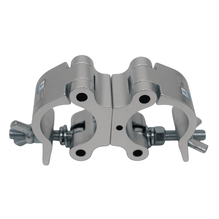 Doppio Gancio Aliscaf in alluminio, ideale come supporto per luci e teste mobili su traliccio, truss all’americana da palco, strutture per palcoscenico, per tralicci con diametro 50-60 mm. Materiale: alluminio. La doppia costruzione dei ganci supportano un peso ognuno da 500 kg consentendo di collegare in modo sicuro due corde principali. Il gancio è girevole a 360°