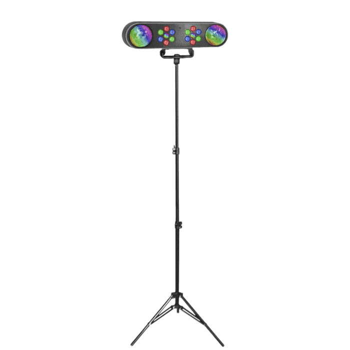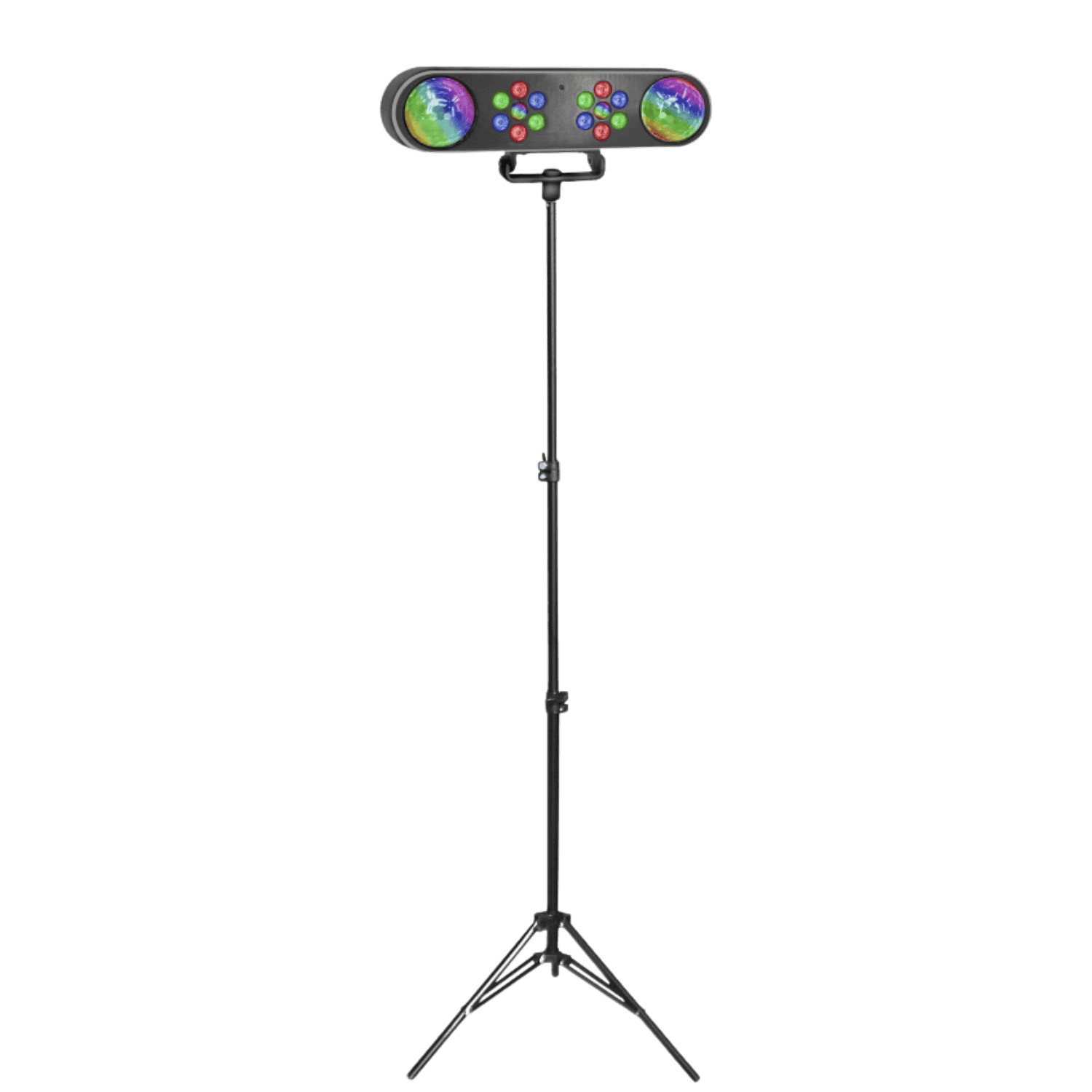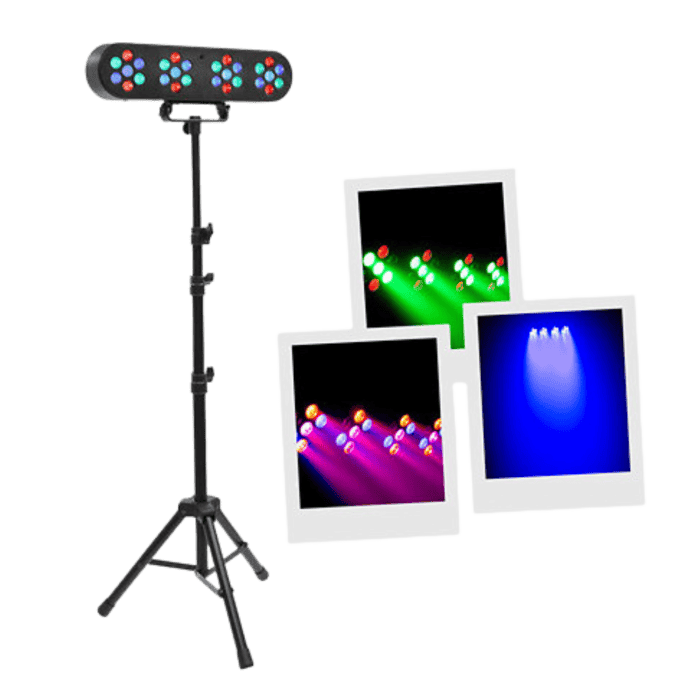 Set di luci economico ideale per feste private e per creare l’atmosfera in un bar o karaoke. Si compone di una barra orizzontale su cui sono integrati 28 LED RGB da 1 W. Ogni LED proietta su un angolo di 25° e l’intensità della luce può essere regolata da 0 a 100% tramite il telecomando incluso. Il dispositivo ha anche una modalità di rilevamento automatico o musicale. La barra luminosa è indipendente dal piedino regolabile in altezza fornito nel kit, che ne consente l’installazione su un traliccio.