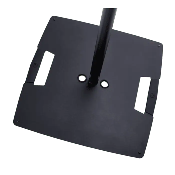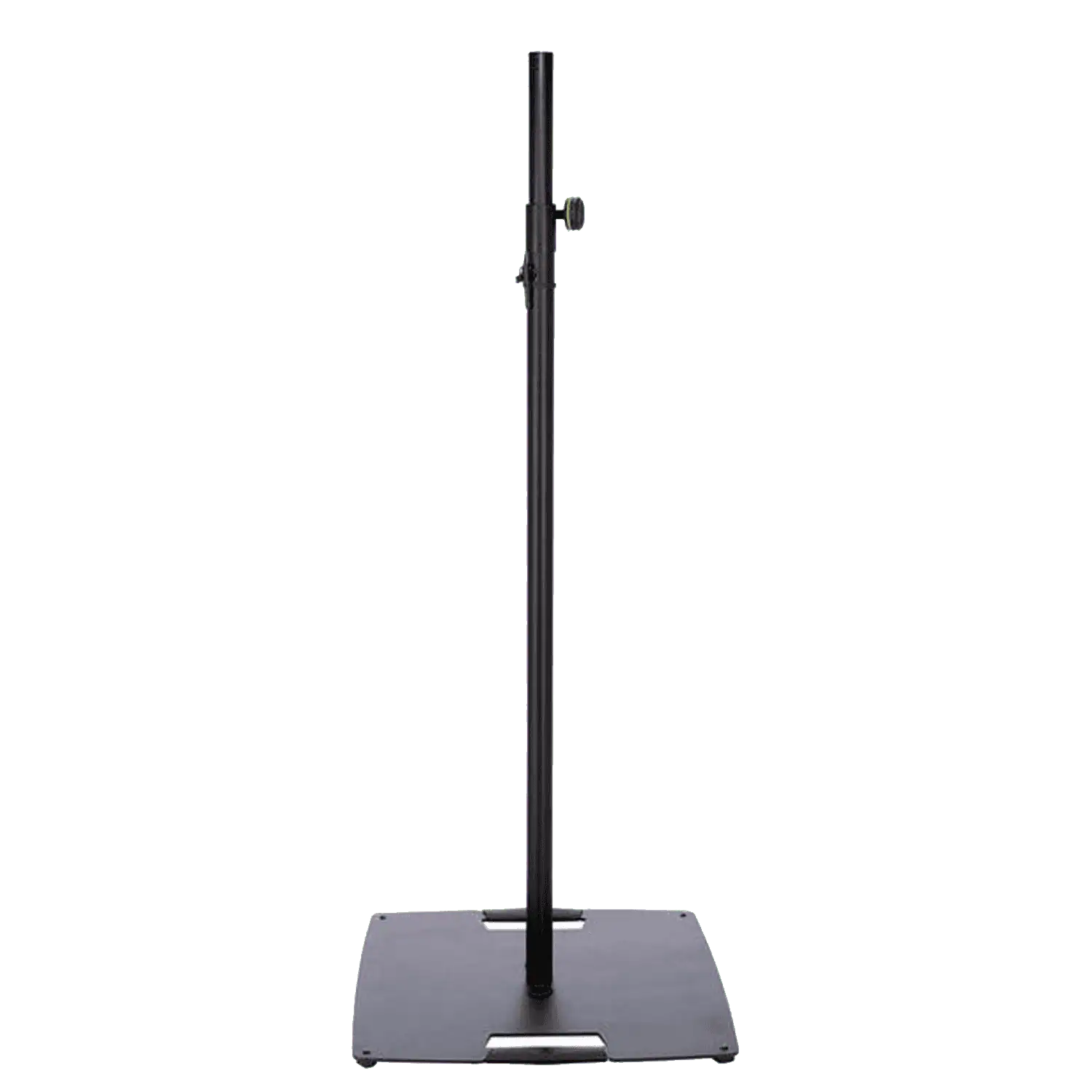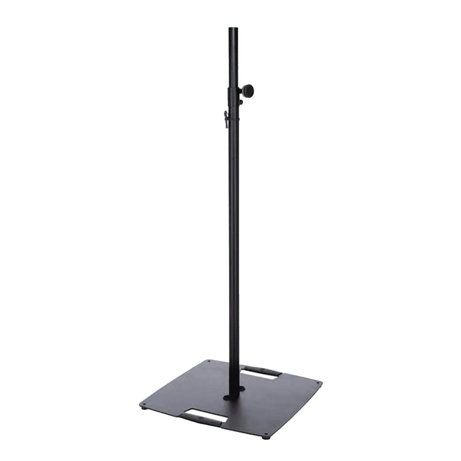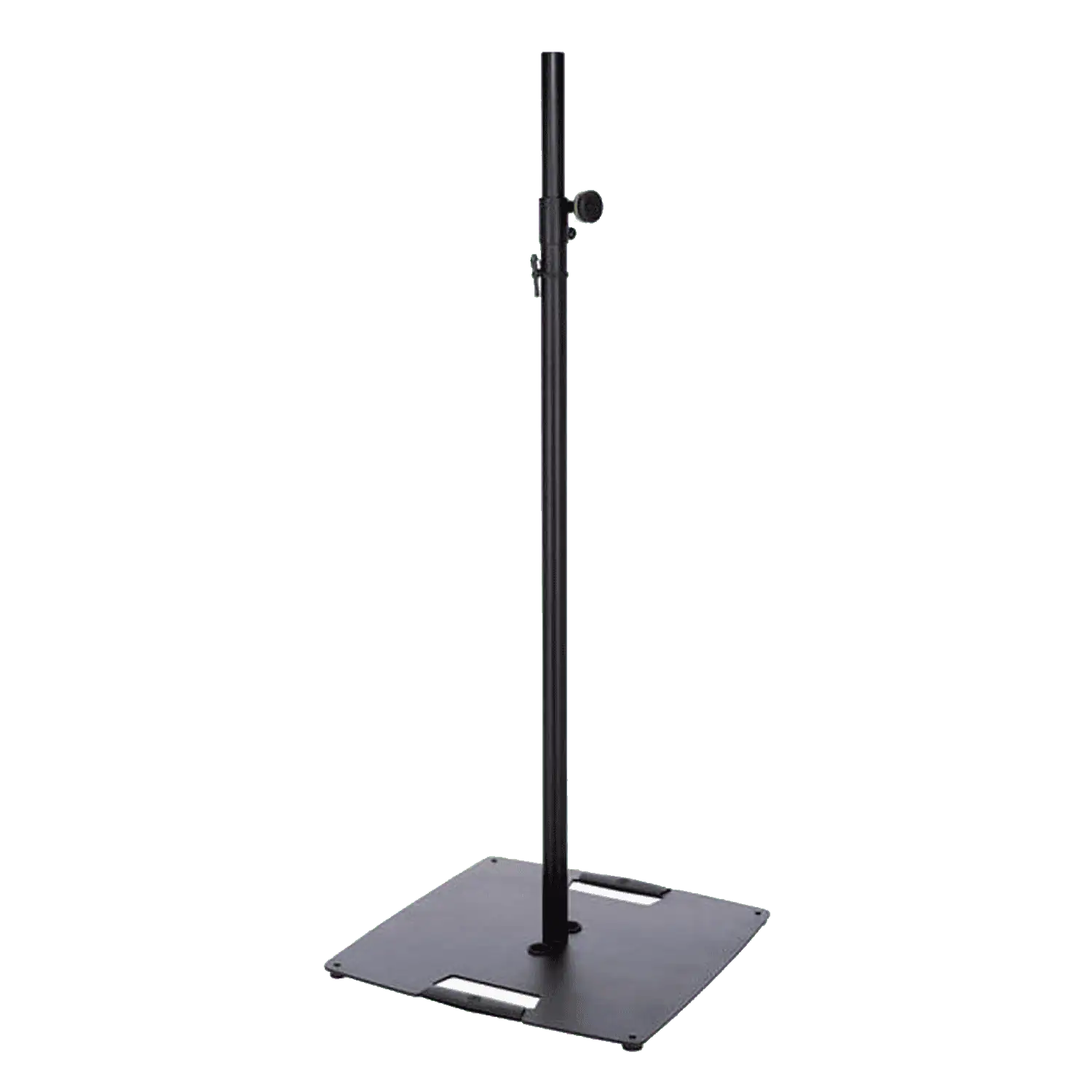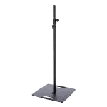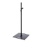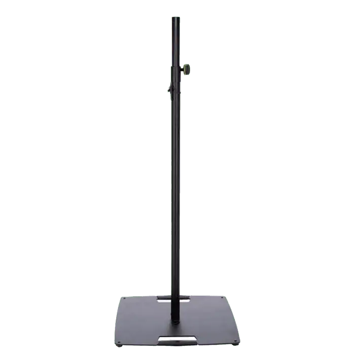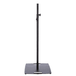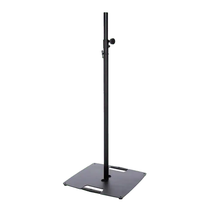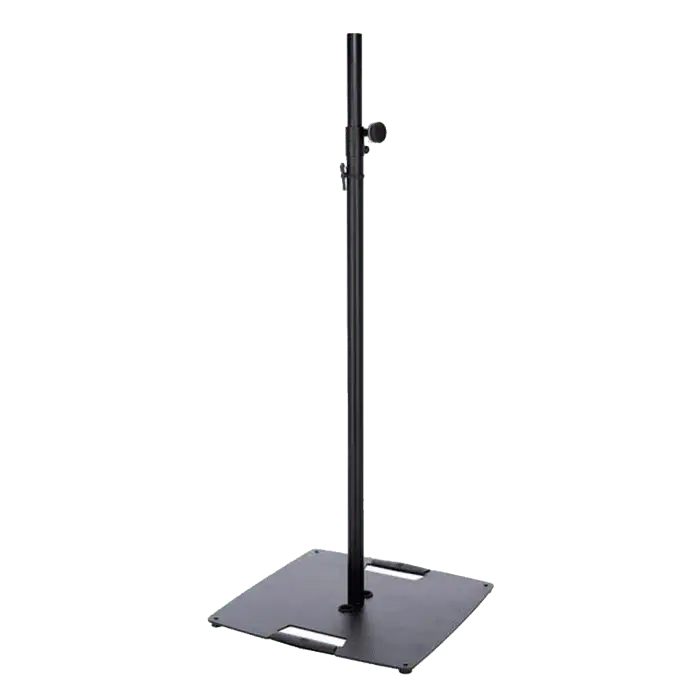 Supporto stativo per fissare in alto luci e casse, dotato di una base d’appoggio quadrata in acciaio, l’altezza è regolabile mediante vite di serraggio e coppiglia di sicurezza.