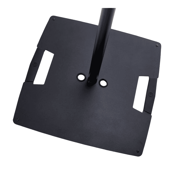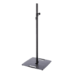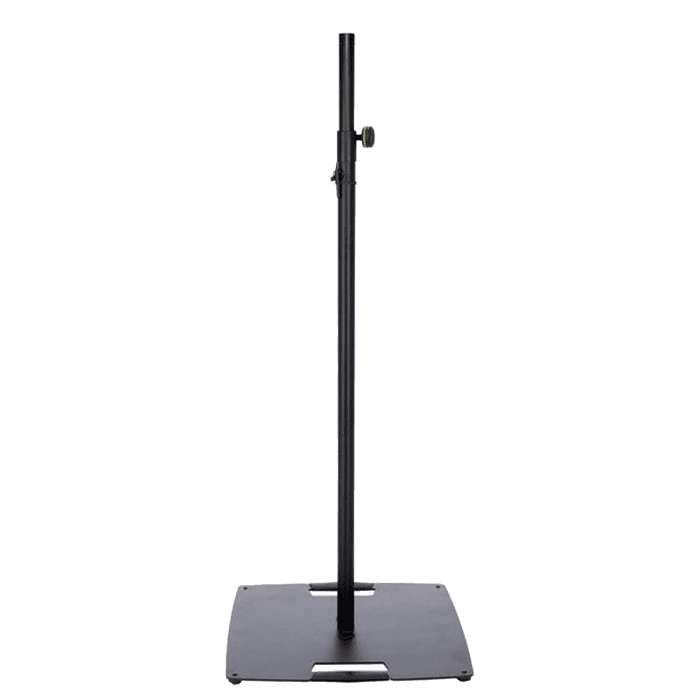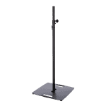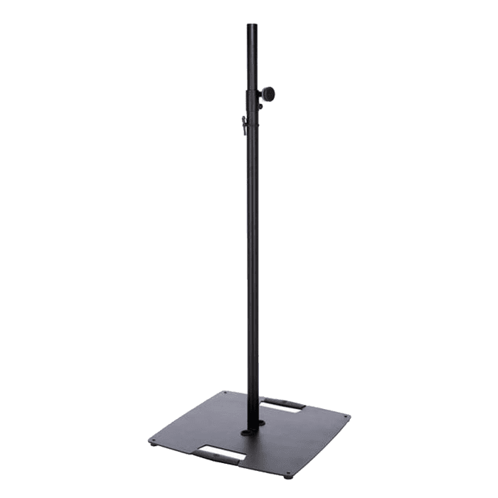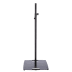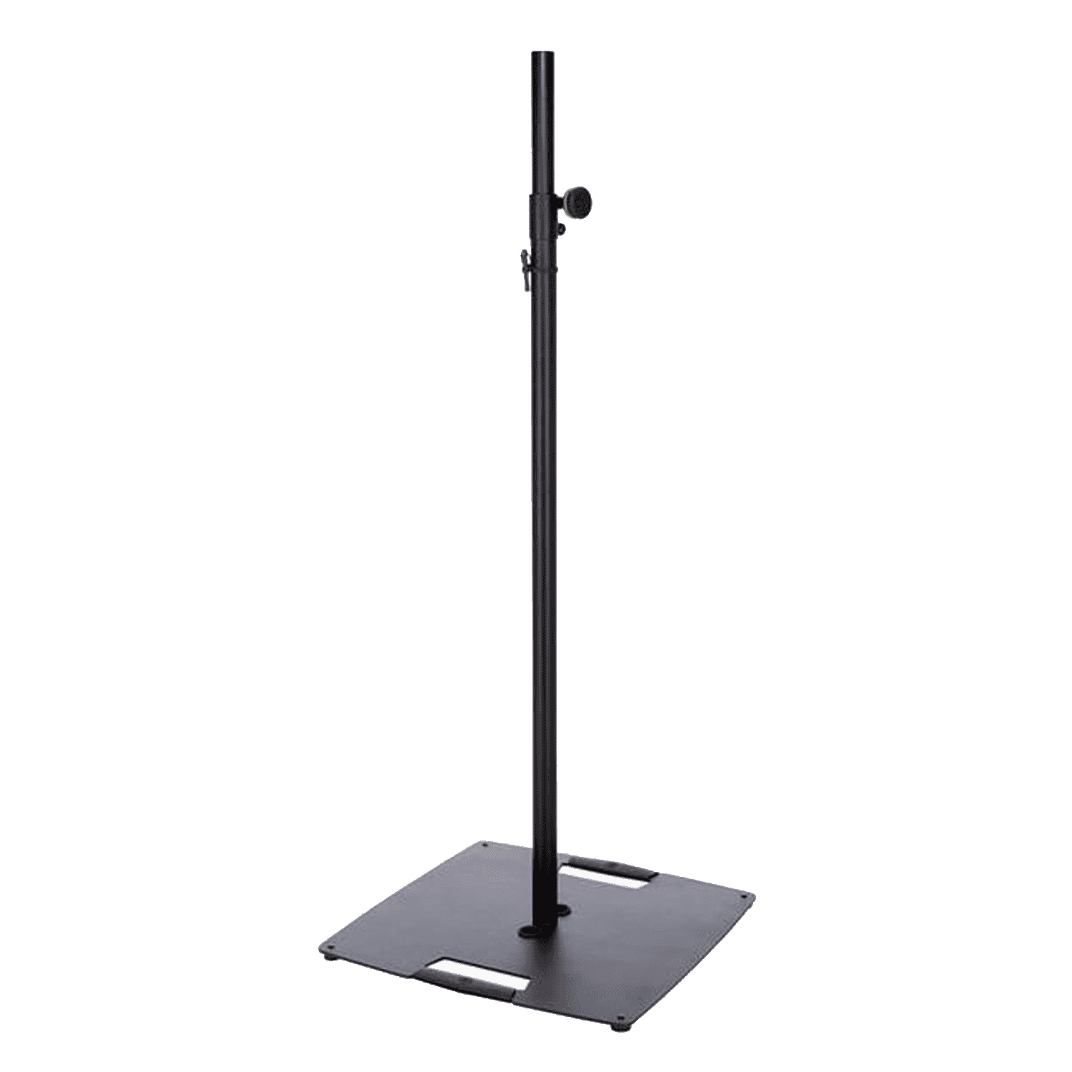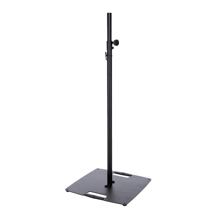 Supporto stativo per fissare in alto luci e casse, dotato di una base d’appoggio quadrata in acciaio, l’altezza è regolabile mediante vite di serraggio e coppiglia di sicurezza.