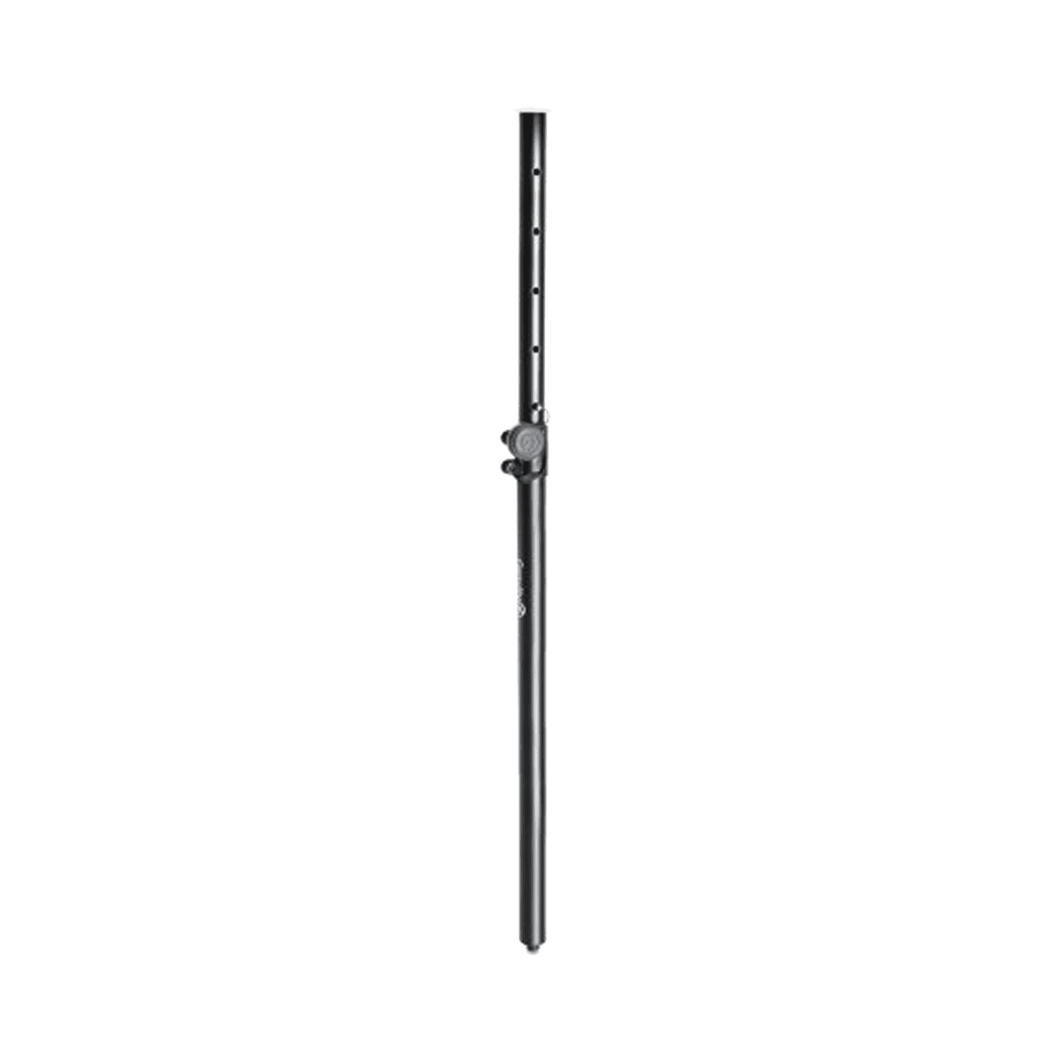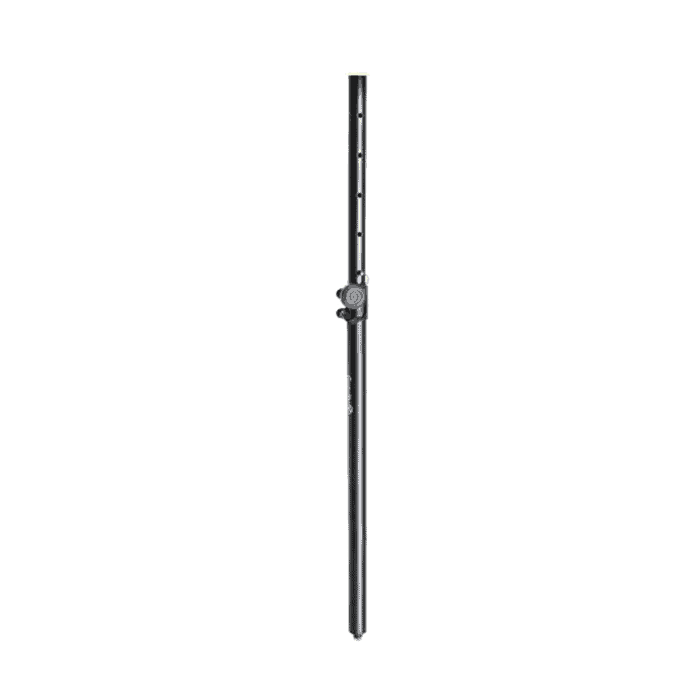 Supporto distanziatore cassa-subwoofer regolabile in acciaio con terminale inferiore avvitabile (provvisto di vite M20 x 2.5). Dotato di meccanismo di chiusura a vite con pin in acciaio estremamente stabile, con vite di regolazione ergonomica e perno di fissaggio che consente di regolare l’altezza in modo sicuro.