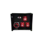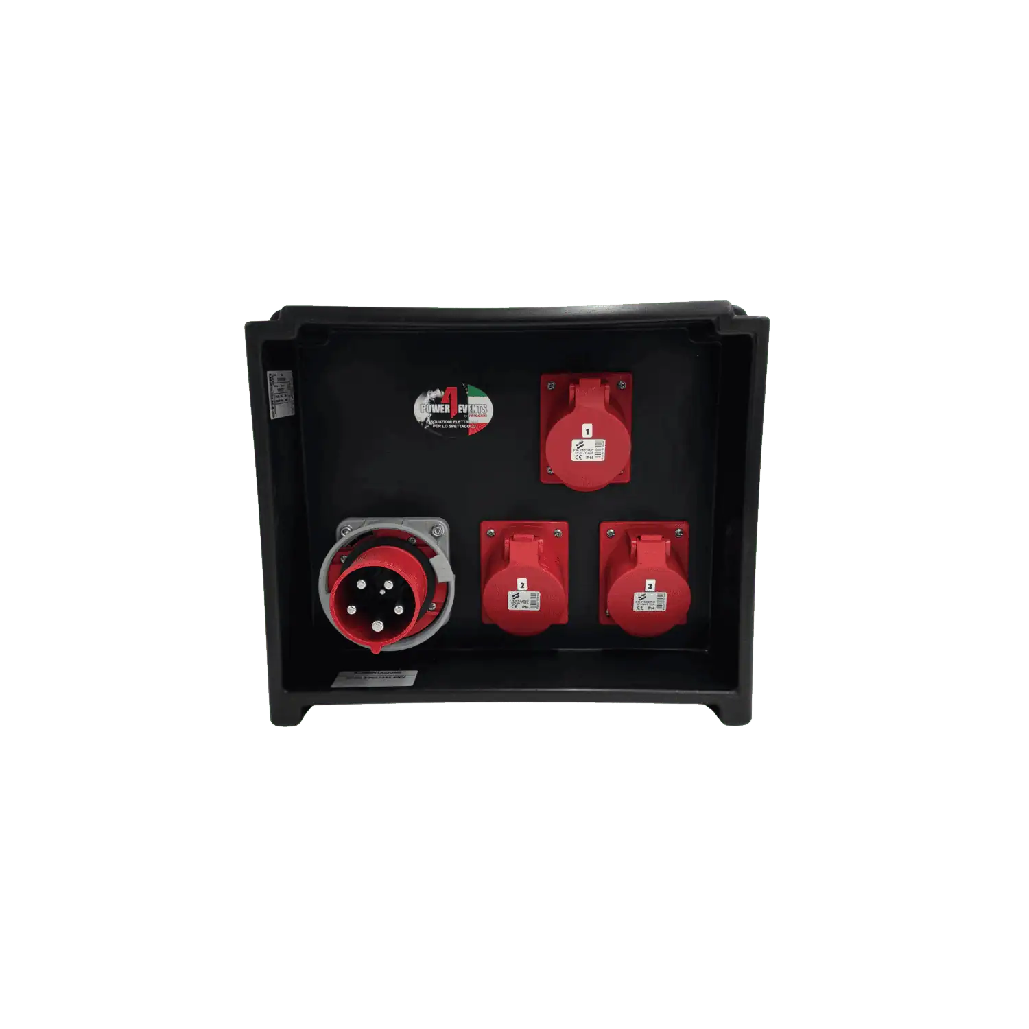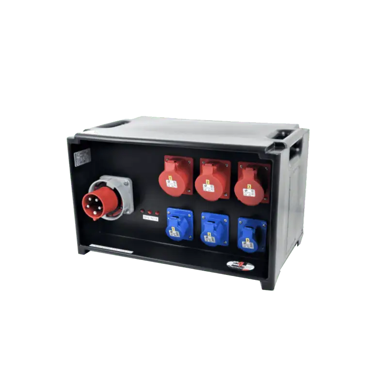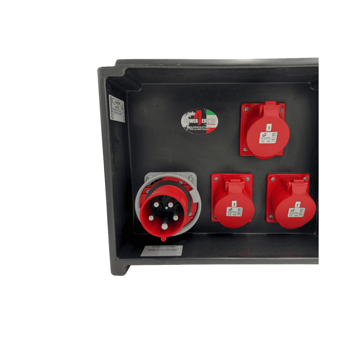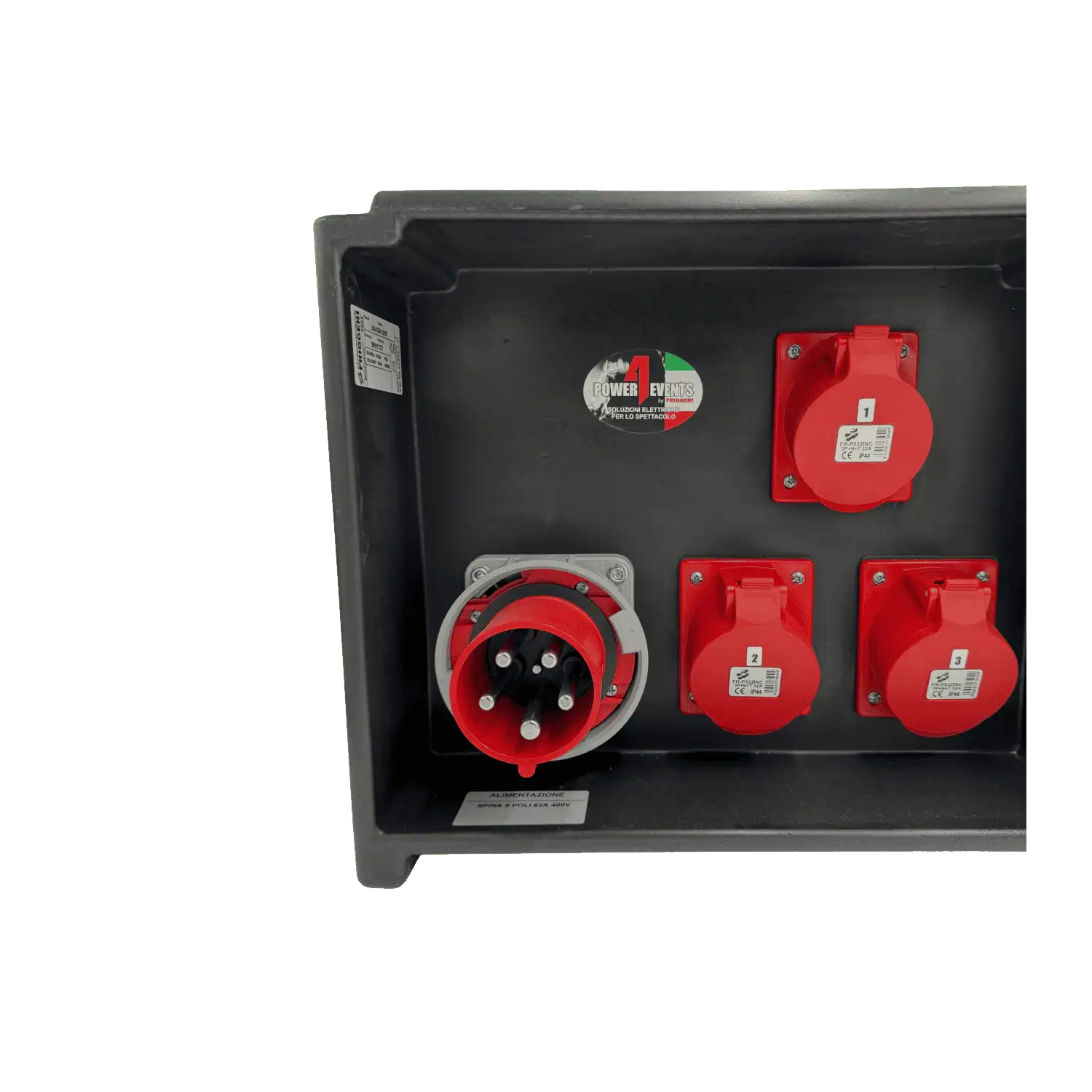 Cassetta in polietilene antiurto in colore nero con maniglie ergonomiche per il trasporto integrate configurazione prese-interruttori fronte/retro. Prese protette individualmente, spie di segnalazione rete LED sulle 3 fasi e voltmetro digitale trifase a pannello