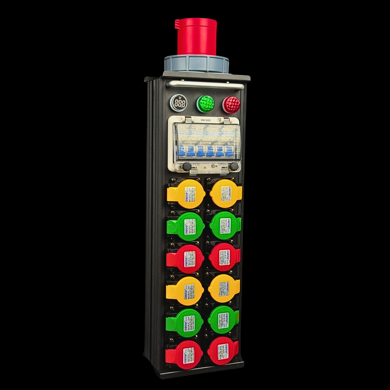 Quadro elettrico trifase 32A da distribuzione per eventi e spettacoli, con prese industriali CEE colorate, interruttori magnetotermici di protezione, struttura in alluminio, ideale per service audio luci, DJ, concerti, palco e installazioni temporanee