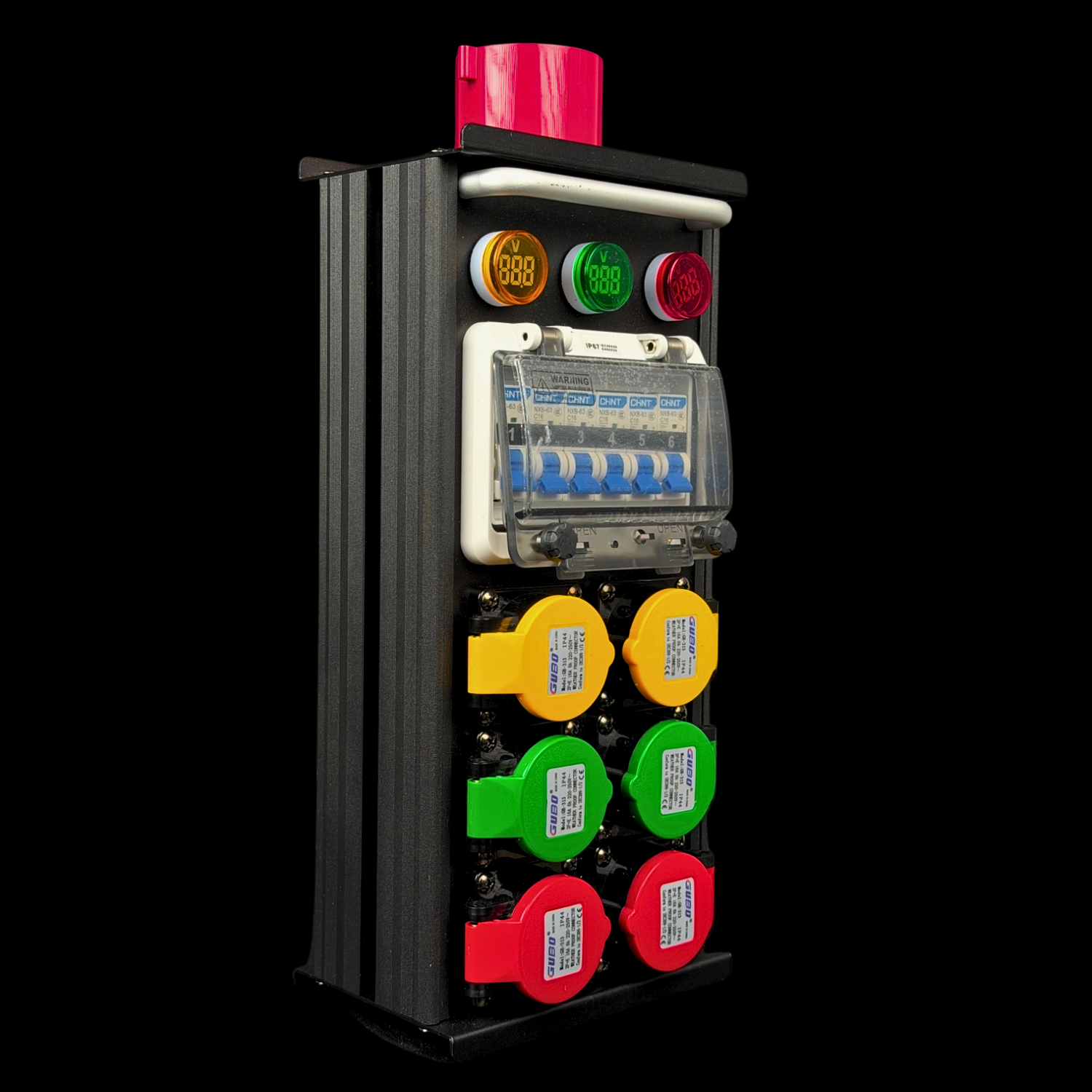 Il quadro è dotato di 6 uscite CEE 16A monofase, suddivise per fase e riconoscibili grazie alla codifica cromatica professionale (giallo, verde, rosso). Questa caratteristica è fondamentale nei contesti live, poiché consente una distribuzione equilibrata dei carichi elettrici tra le fasi, evitando squilibri e problemi di alimentazione.