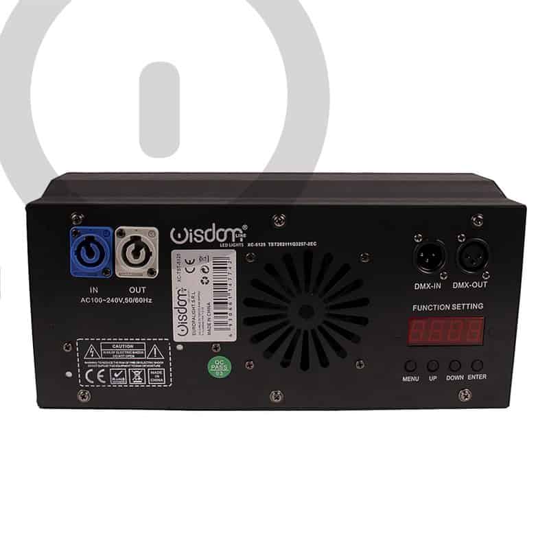 Il sistema di connessione PowerCon In/Out garantisce un collegamento elettrico sicuro e affidabile, mentre gli ingressi e le uscite DMX consentono di collegare più dispositivi in catena. Il display LCD integrato semplifica configurazioni e settaggi, rendendo l’apparecchio utilizzabile anche da operatori meno esperti.