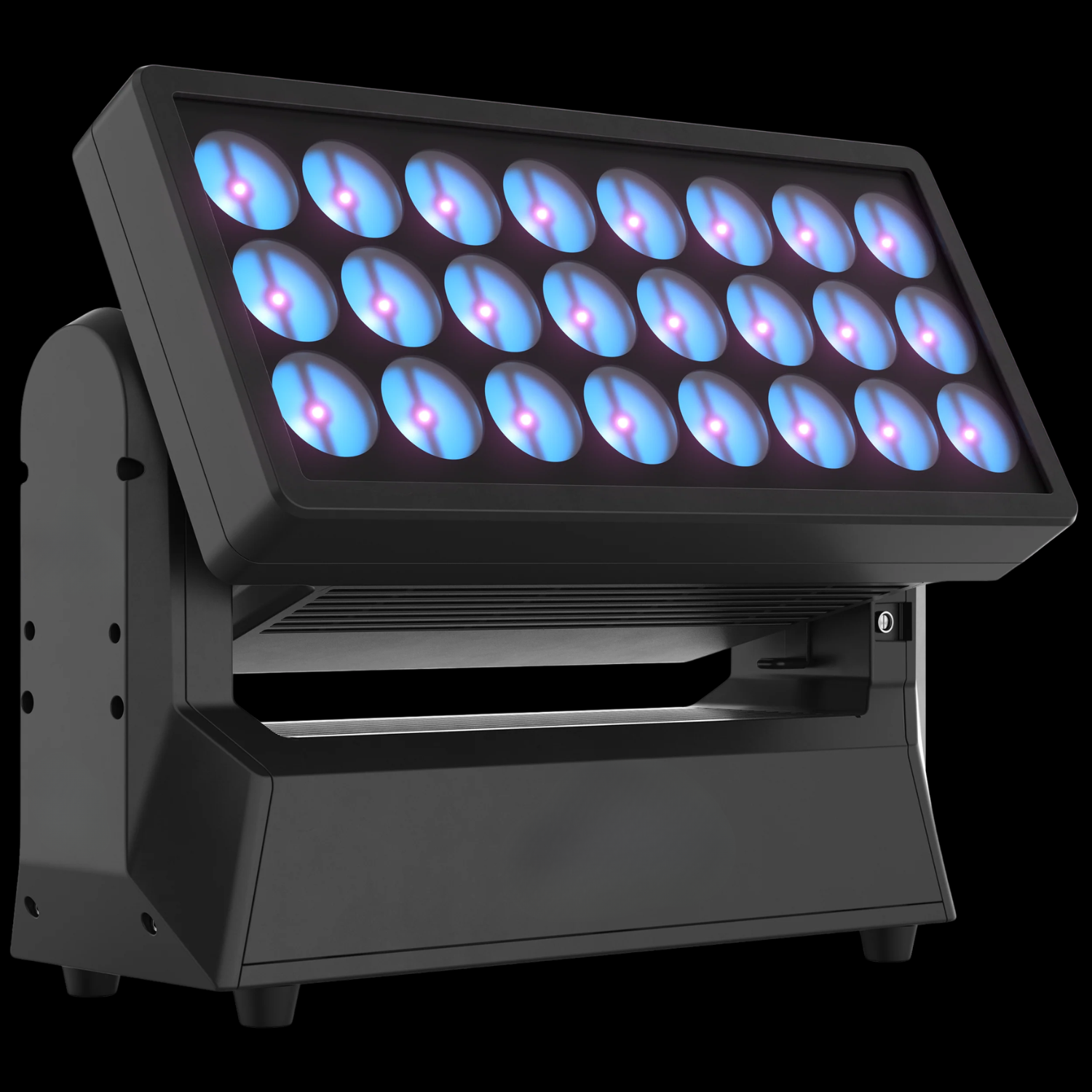 Il sistema integra una potente configurazione luminosa composta da 24 LED da 40W ad alta intensità affiancati da 24 LED RGBW 4in1 da 5W, offrendo una perfetta combinazione tra luce bianca intensa per effetti strobo e illuminazione colorata uniforme per effetti scenografici avanzati. Questa struttura permette di alternare flash potenti, effetti ritmici e lavaggi cromatici con estrema precisione.