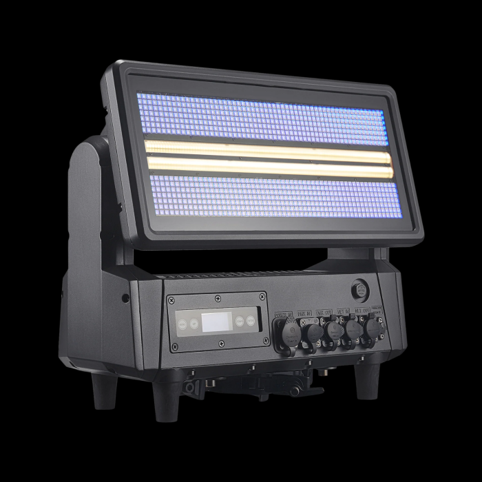 Il sistema integra una potente configurazione luminosa composta da 784 LED RGB da 0,5W e 392 LED bianchi da 3W, offrendo una combinazione ideale tra effetti strobo intensi, wash colorati e illuminazione scenografica dinamica. Questa doppia sorgente luminosa consente di ottenere effetti visivi altamente versatili, passando da flash ad alta intensità a illuminazioni colorate uniformi.