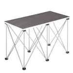 Tavolo per console trasportabile e richiudibile indicato per postazioni mobili e temporanee da DJ. Formato da un piano in compensato di betulla rivestito in antigraffio a nido d’ape e da una struttura telescopica a ragno, robusta e leggera, in alluminio pieghevole con appoggio su 6 punti.